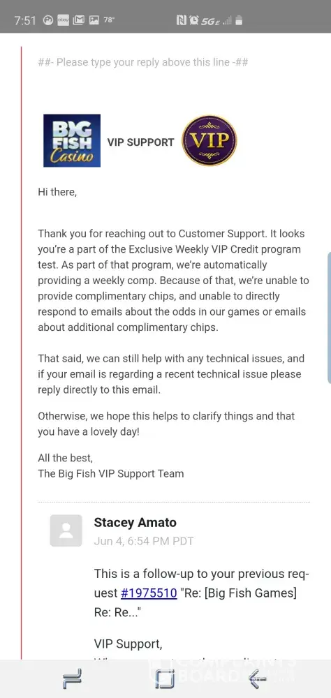 I'm due 126 mil my emails are being ignored I'm in touch with Jeff Karp executive of big fish games personal messages sent... Tate on customer service is ignoring my emails I'm fuming... I've paid now I want what I've paid for due now is 126 mil.. I'm saving and sending all corressponance to Jeff karp also.. so the quicker this matter is solved better for all.. and I'm in contact with Washington gamblers commission to... as this will have to go to next level if the right thing isn't sorted today.. receipts have been sent but ignored.. so I've paid now I want this adding to my account 126 mil owed onto my player is number [protected] thankyou..