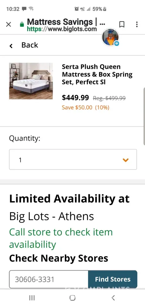 I was in Big Lots shopping one day I seen they had a sale on mattresses about three or four of them was stacked up on the side. The ad said mattresses for 227. Mark down from 499. I contacted one of your furniture salesperson ask them how much do I need to put down to hold This mattress? She told me. I put down the money to hold the mattress. The furniture...