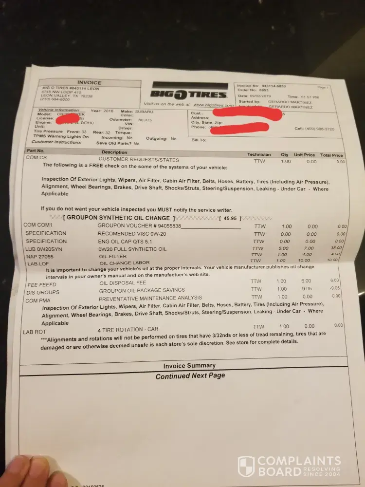 Read full complaintcustomer #: [protected] - front end / tires / brakes