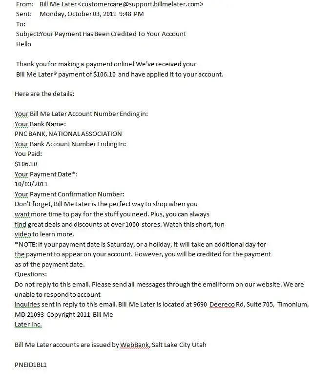 I have never used Bill Me Later because the concept alone seems like it opens Pandora's box to scams. I prefer to pay for my stuff right away and have it be "over and done with."