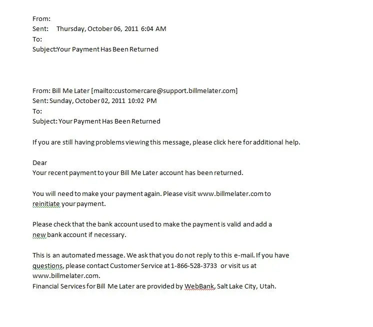 PAID MONTHLY PAYMENT ON OCT. 2ND 2011 RECEIVED EMAIL STATING QUOTE: Your recent payment to your Bill Me Later account has been returned.