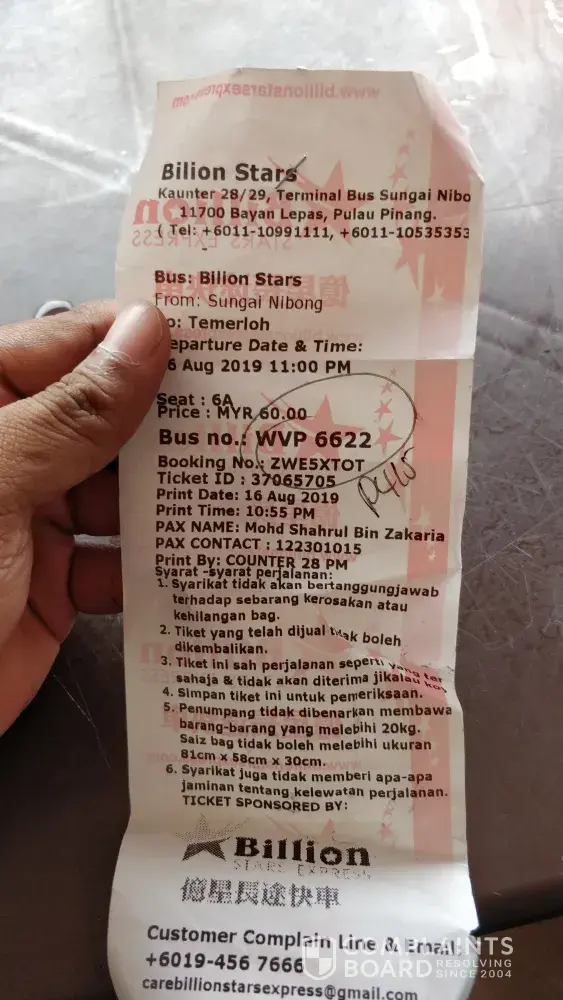 I brought a fake ticket from counter 5, sungai nibong. The counter refuse to pay back me my money. Please look into it this issue. I have consult other counter saying this is a fake ticket. Never go counter 5, sungai nibong. I have the evidence attached. The bus driver say this seat is already sold to another person. This ticket is sold two time. We fire a police report to counter 5, they say going to pay, but until now they will keep ignore our call. I everyone can be alert for this counter.