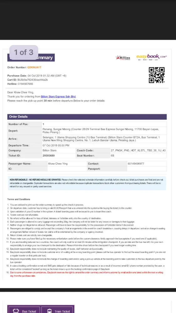 我开始买的时候我在golden mile complex 哪里买票那个untie说10点票有是最后,我说ok我给了$120后来,我在9.30pm走过去确认下bus 号码结果那个年轻的马来女生告诉我(不好意思我们10点的车已经满了,没有位子了,我换一张去tbs然后转战去ipoh给你,可以吗?)我说(不好意思我没有去过tbs,请问有没有直接去ipoh的)后来,他给我了10.30pm的票,我就在黄金大夏那边楼梯等。。。
