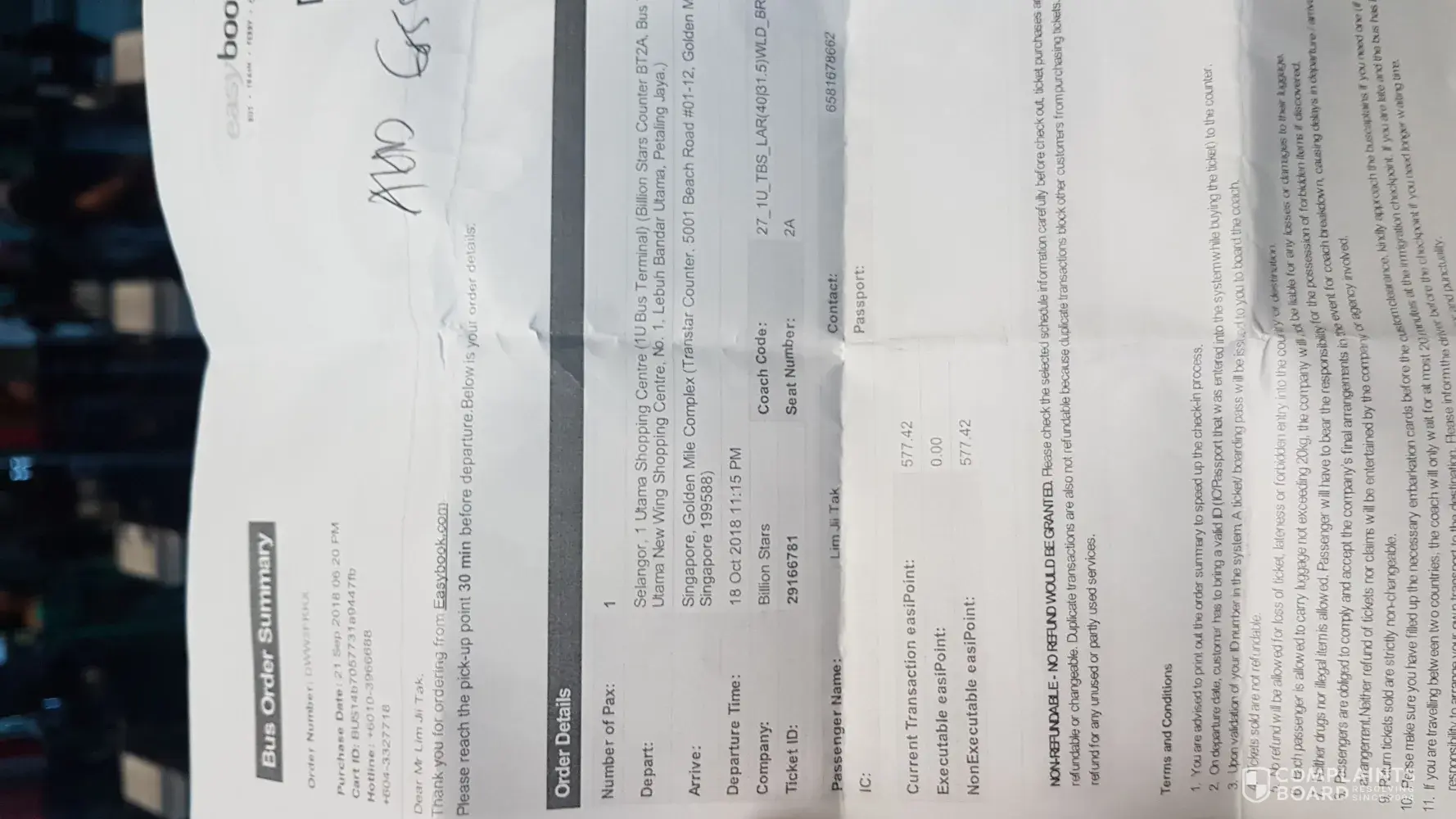 I had booked bus ticket from onlinebooking.com, bus company - Billion Stars at 12.45am, pick up point at Kitchener Complex.