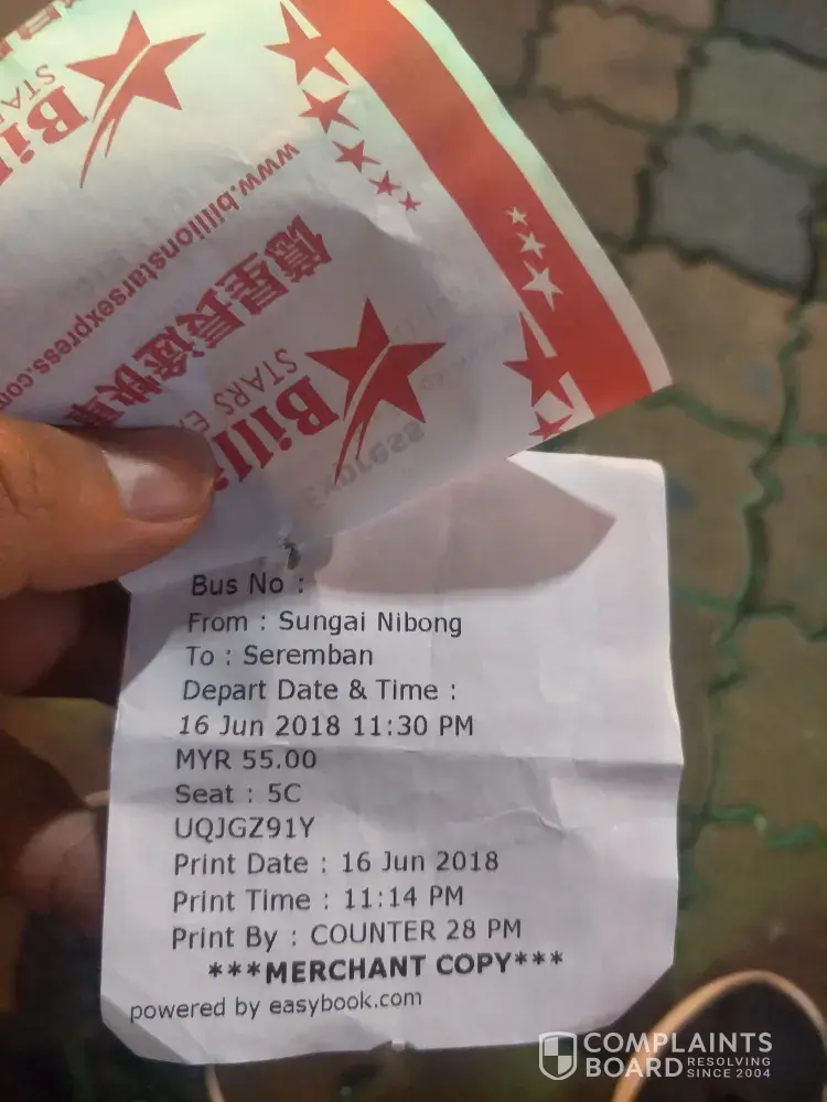 Saya telah membeli ticket bus express dari Company Billion Star Express pada 6/4/18 secara online dari web easybook.com. Jadual perjalanan saya adalah pada 8/4/18 jam 7.45am dari Penang ke Kuala Lumpur pickup saya di Komtar, Penang. Tetapi bila saya pergi ke kaunter bus express yang terletak di 33-G-14 Prangin Mall untuk cetak tiket asal, saya dimaklumkan oleh kerani yang berkenaan bahawa tiket pada tarikh, masa dan tempat saya naik bas, tidak [protected]@ ada di Komtar Penang.Saya perlu datang awal ke Komtar iaitu seawal jam 6.30am supaya mini van company hantar saya ke Stesen Bas Sungai Nibong agar saya meneruskan perjalanan saya pada jam 8.30am.Tidak ada jadual bas dari Billion Stars yang bertolak sama ada jam 7am, 7.45am @ 8am.Saya akan membawa perkara ini ke perhatian pihak KPDNKK dan SPAD