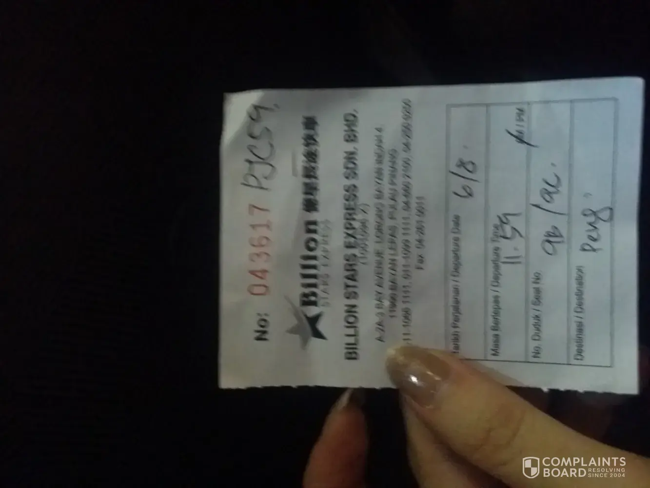 Sy nk buat aduan. Driver billion star yg kurang ajar. Sy masih didlam bas ni. Perjalanan dri pulau pinang ke tbs. No plate bas ahd6855. Sy byar rm30 utk perjalanan yg slesa. Tapi yang sya dpat is driver yg dduk di seat depan sya dan suka hati baringkan krusi. Bila ditegur utk ke hadapan, dy mrahkan sy balik. Is this the best couch u can give me? How rude ur staff is. Bukankah bilik utk driver brehat dah disediakan? Dan adakah pihak driver berhak utk pertikai rm30 sy byar kpada billion star dengan nyawa sy? Sy byar rm30 bukankah utk sy slamat smpai ke destinasi? Adakah juga pihak driver berhak utk marah cust balik di dlm bas? Pihak billion stat express minta ambil berat tentang adab driver. I made complain because we as cust cannot choose the driver. Klau boleh pilih driver, for sure skua orng akn pilih yang buat mesra pelanggan. Klau tak mesra pelanggan pon at least the one donot disturb the passenger. Thats all tq.