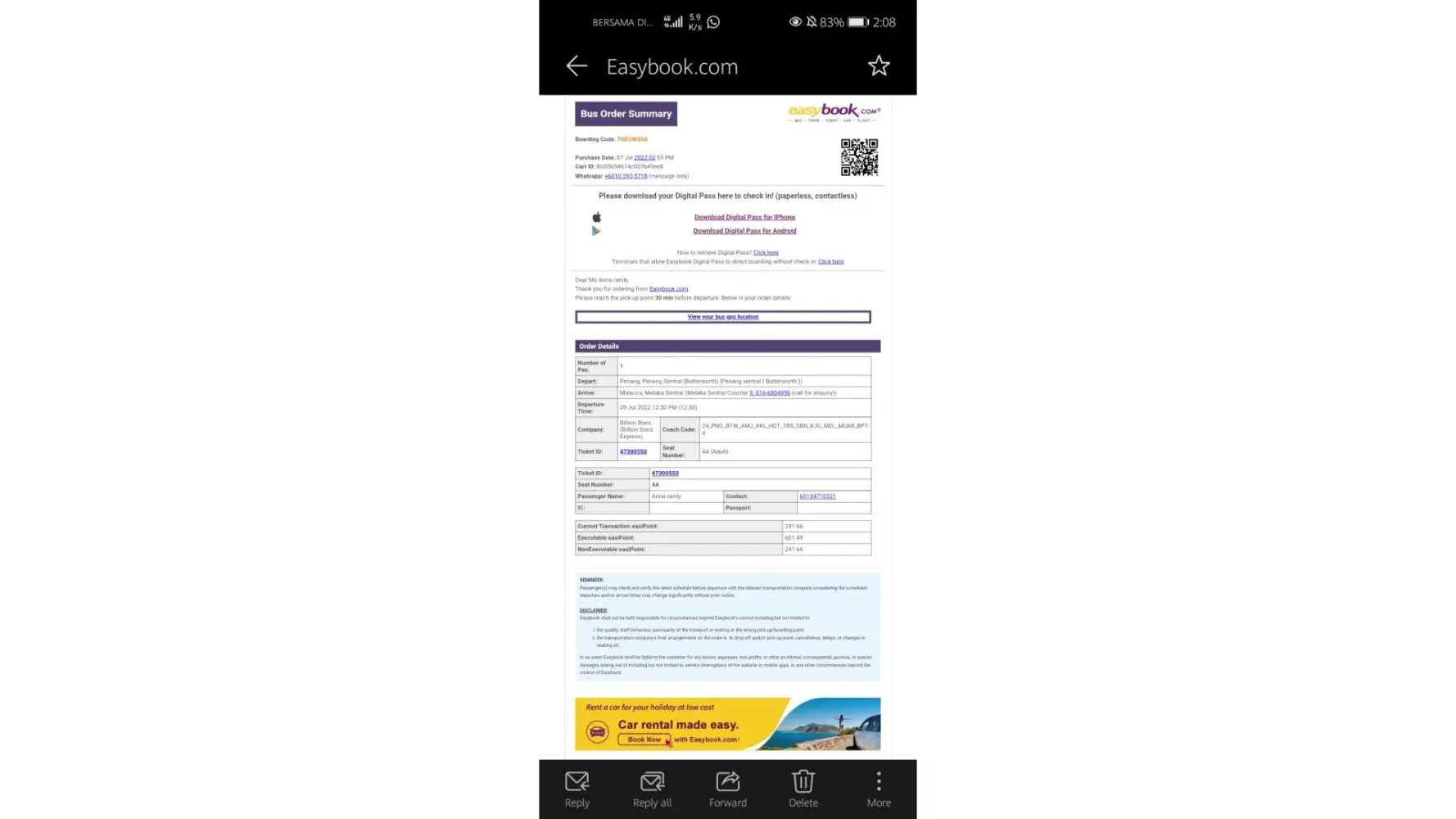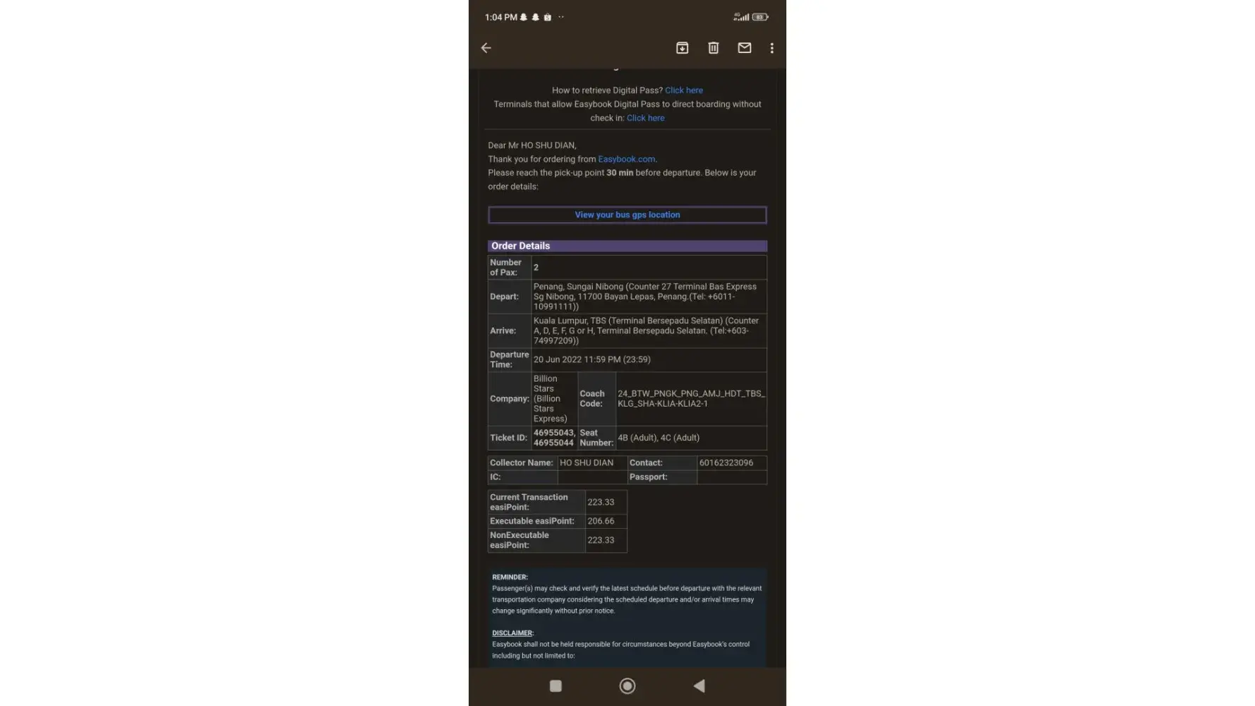 Bus Date: 14 AUGUST 2022 (17:45 HENTIAN DUTA TO PENANG SENTRAL)