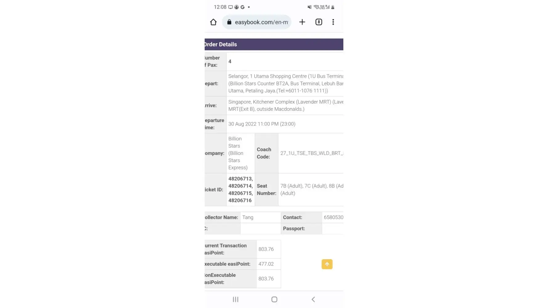 Trip booked for 4 from 1utama to singapore mile on 30-aug 2022 time 11pm.Coach was very late and arrived at 1u about 1230am.