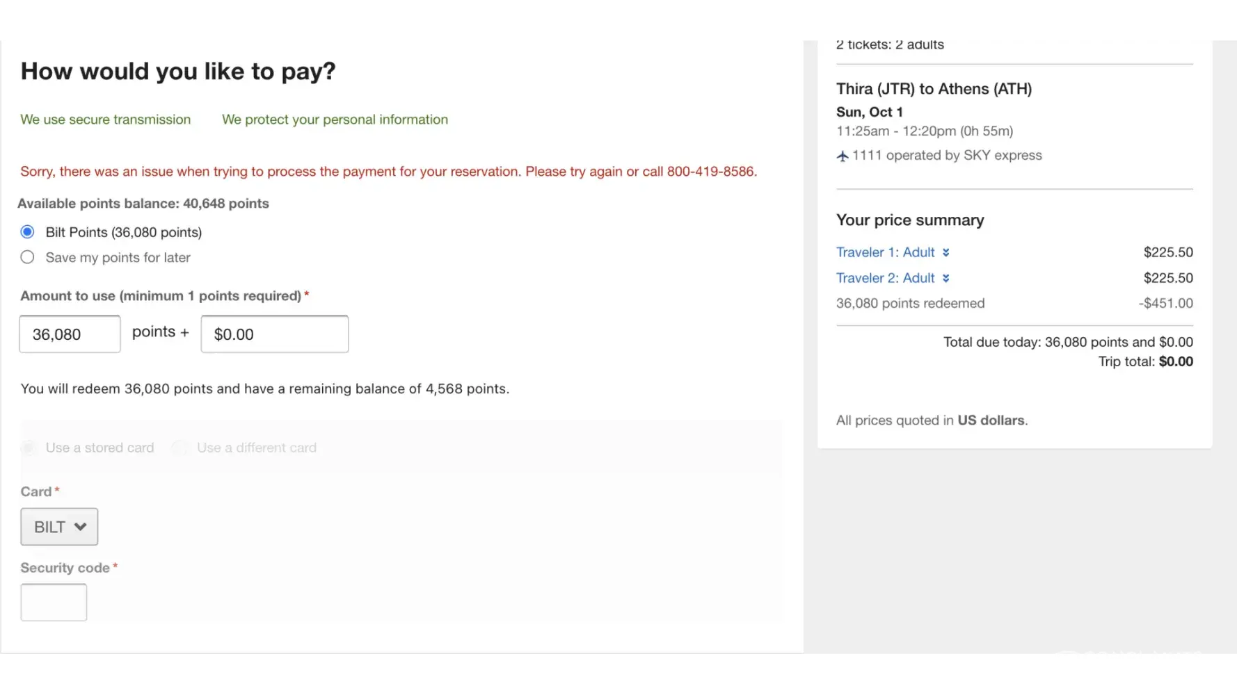 I first contacted Bilt August 2nd because I was receiving a "problem processing payment" error message. After retrying only using points and contacting customer service numerous times, I was told it's an internal issue with my account. Since August 2nd I have called and messaged numerous times. It's still broken and now there is no phone number to even call for help, as it has changed to a french travel agency.