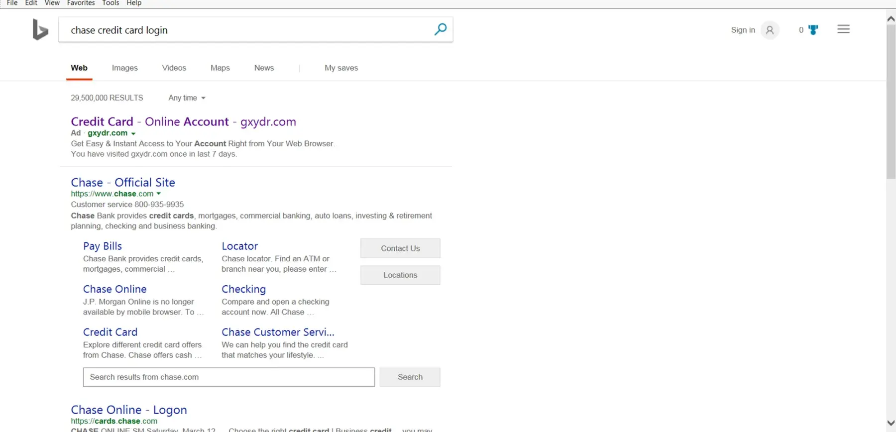 Top search result is a fraud on Bing I searched Bing for Chase Bank log on and the top result that came up is a fraud.How does Bing let something like this happen?