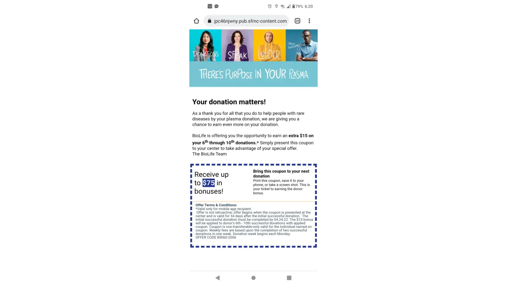 I donate regularly at my local site on Finger Road in Green Bay Wisconsin. On March 24th I donated at this site and asked that the returning customer coupon code be entered (offer code [protected]). The offer was for six visits paid out at: $20, $100, $20, $100, $20, $240. On March 24th they entered the code, I donated and received $20. This wa...