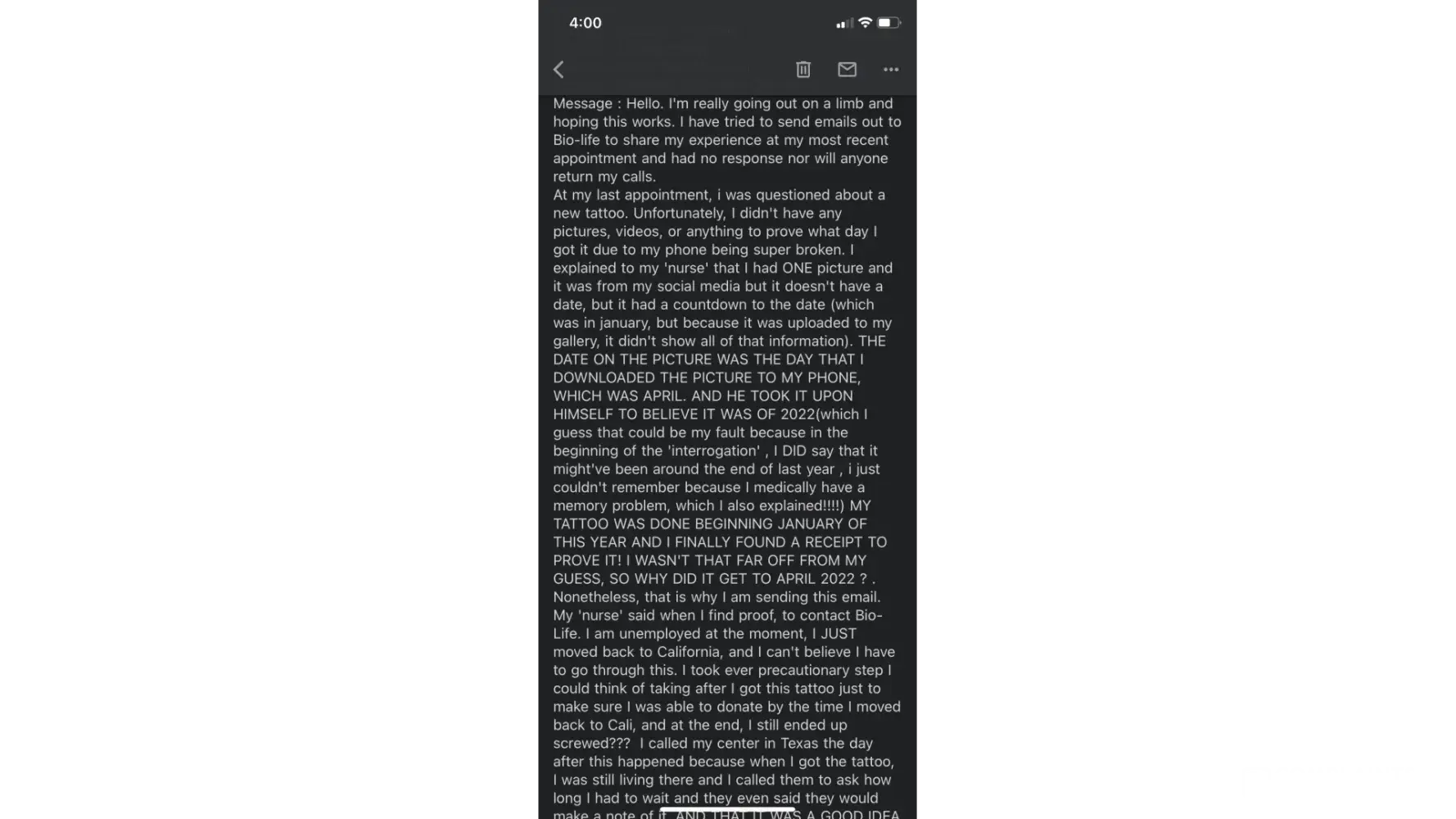 At my last appointment, i was questioned about a new tattoo. Unfortunately, I didn't have any pictures, videos, or anything to prove what day I got it due to my phone being super broken. I explained to my 'nurse' that I had ONE picture and it was from my social media but it doesn't have a date, but it had a countdown to the date (which was in january, but because it was uploaded to my gallery, it didn't show all of that information). THE DATE ON THE PICTURE WAS THE DAY THAT I DOWNLOADED THE PICTURE TO MY PHONE, WHICH WAS APRIL. AND HE TOOK IT UPON HIMSELF TO BELIEVE IT WAS OF 2022(which I guess that could be my fault because in the beginning of the 'interrogation' , I DID say that it might've been around the end of last year , i just couldn't remember because I medically have a memory problem, which I also explained!) MY TATTOO WAS DONE BEGINNING JANUARY OF THIS YEAR AND I FINALLY FOUND A RECEIPT TO PROVE IT! I WASN'T THAT FAR OFF FROM MY GUESS, SO WHY DID IT GET TO APRIL 2022 ? . Nonetheless, that is why I am sending this email. My 'nurse' said when I find proof, to contact Bio-Life. I am unemployed at the moment, I JUST moved back to California, and I can't believe I have to go through this. I took ever precautionary step I could think of taking after I got this tattoo just to make sure I was able to donate by the time I moved back to Cali, and at the end, I still ended up screwed? I called my center in Texas the day after this happened because when I got the tattoo, I was still living there and I called them to ask how long I had to wait and they even said they would make a note of it, AND THAT IT WAS A GOOD IDEA TO CALL. SO WHY WAS THOSE NOTES NOT FOUND? I DON'T KNOW, HOW IS THAT MY FAULT? The center kept asking if I remembered who i spoke to and I said no, I didn't bother to ask for a name, I wasn't able to donate for a while anyways. So when I came to this NEW center in Pomona, I tried so hard to explain to this guy that I already had a talk with the previous center I was at, and that they already told me how long I needed to wait, which is why I was there to donate because it was already over the 4 Months. WHY DID THIS GUY TELL ME IT WAS 6 MONTHS!?!? He didn't need to say it, but it was ALL over his face that he didn't believe me. Why would I need to lie about a tattoo I got? We go to Bio-life to make money, but I am NOT that hard up for money. I TOOK EVERY PRECAUTIONARY STEP I COULD THINK OF AND STILL ENDED UP SCREWED! And the cherry on top- the lack of professionalisms from BOTH bio-life centers. From the attitudes, talking over me, ignoring me!? So now- How can I fix this? Will this affect my eligibility to other centers? I really do want to fix this with BioLife, there's a reason I kept coming back; not every experience was like this. But Like I said, I got back in contact with my tattoo artist and he was able to pull up a receipt for me. If there's a way I can send that over, PLEASE LET ME KNOW.