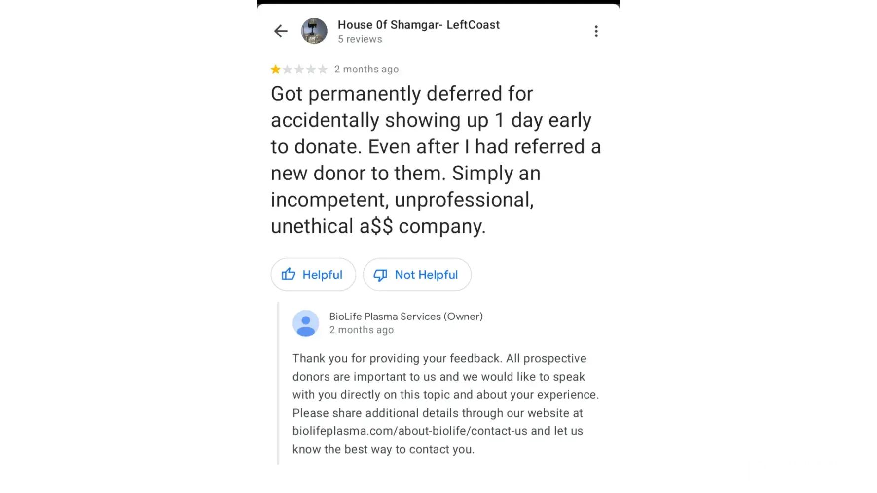 I've been banned from donating plasma at BioLife in 2022 due to coming in 1 day early twice - once at the Tukwila, WA location & once at the Lacey, WA location - both instances were purely accidental & unintentional. I'm strongly convinced that this is a case of AI Inflexibility over Common Human Empathy & Understanding. I was a consistent BioLife donor...
