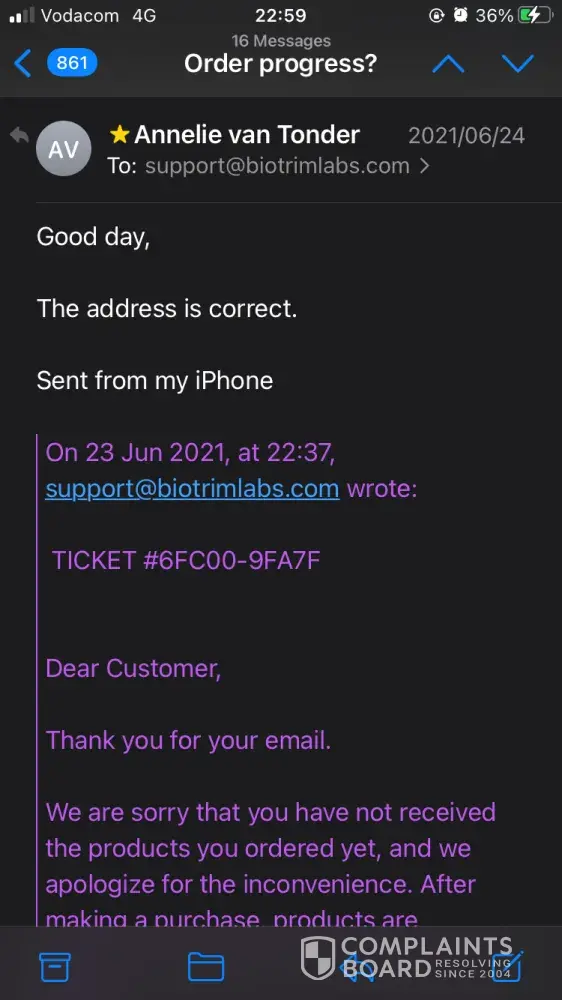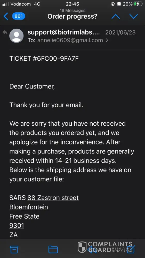 I have order the following on 19.09.2021. I received an e-mail on 03.11.2021 that my order is on its way with a delivery number ASL20210920ZA5473077 stating that delivery usually takes 14 -21 days, by due to high demand delivery may take 3 - 6 weeks. Needless to say I have paid the full amount of R4.308-00 and my order was the following: 6 Keto Extreme Fat Burner and 1 Biotrim Premier and I received confirmation that my order will be shipping on 22.09.2021. More than 6 weeks have passed and I don't received proper feedback as to where my order is. I only received 1 bottle extreme fat burner. I must say I will not recommend this product even if it's working because the response and service I received is pathetic. I have forward about 7 e-mails to [protected]@BioTrimLabs.com by not feedback. Can you please refund me because nobody will accept this poor service.