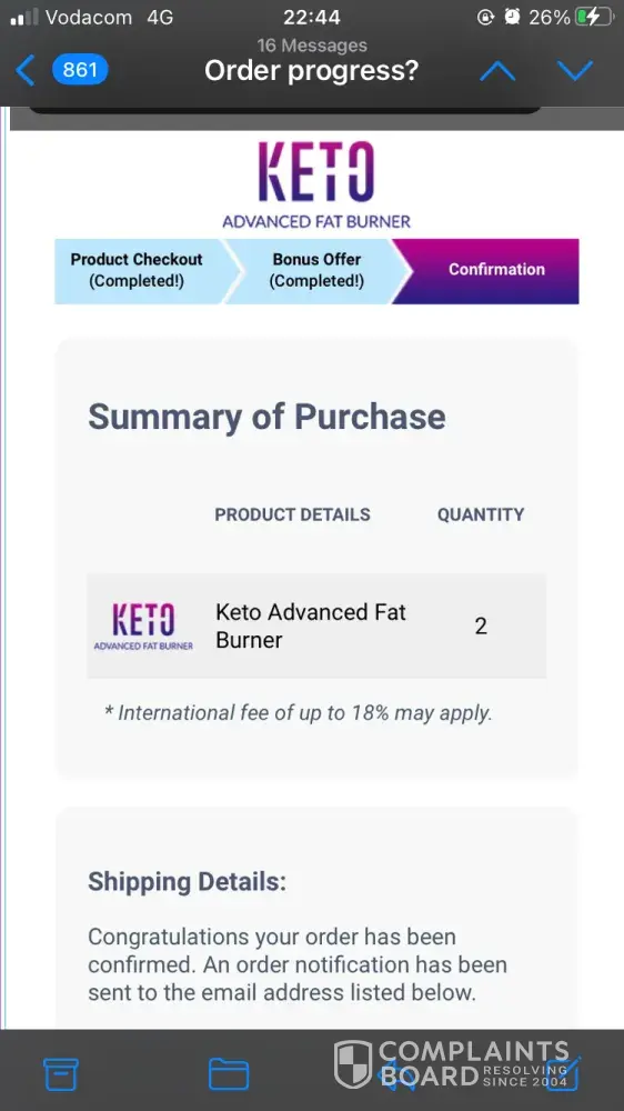 Purchased Keto Advanced Fat Burner on 06/05/2021. Website indicates 4 weeks delivery period. Queried status of delivery on 22/06/2021. They responded by asking me to confirm the delivery address, which I did.