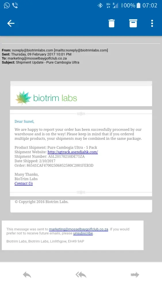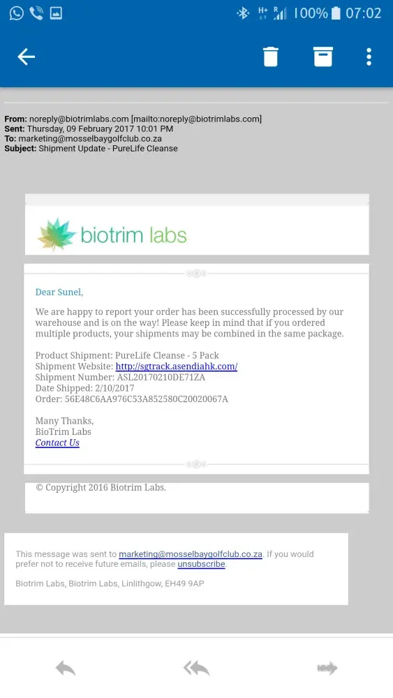 4. The response to congratulate me on my purchase came via a third party gateway i.e. [protected]@biotrimlabs.com via sendgrid.me