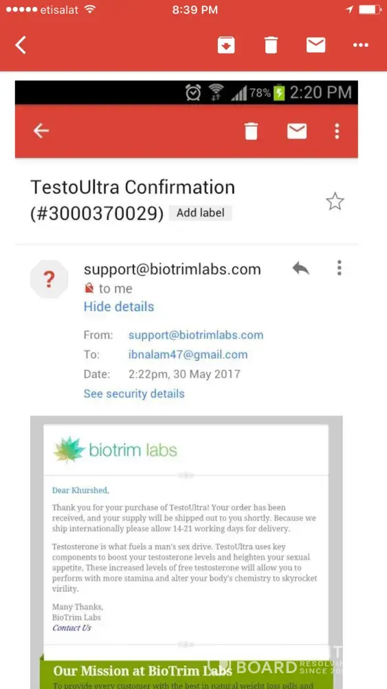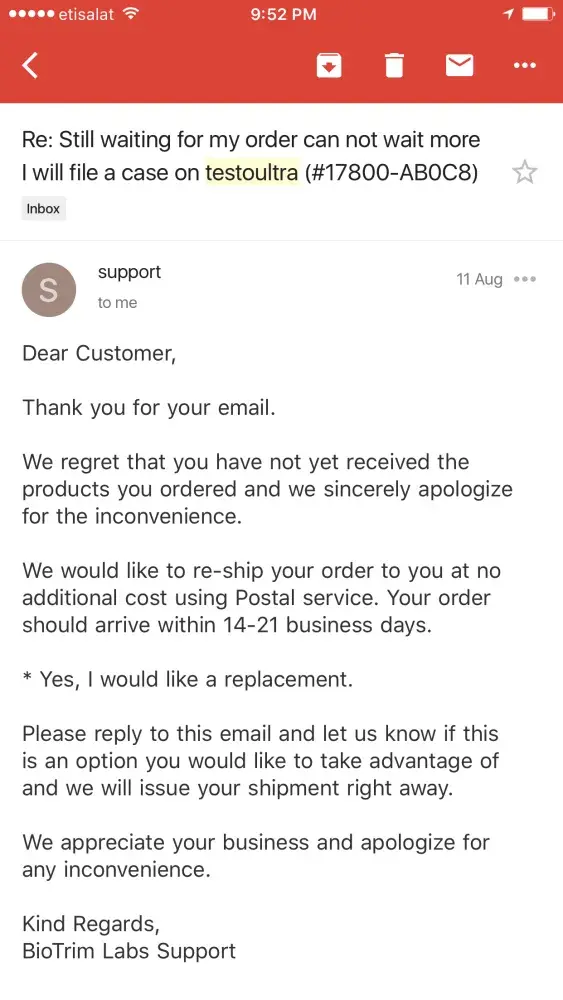 ITS EXTREMELY VERY SAD AND BAD EXPERIENCE WITH BIOTRIM LAB AS I PURCHASED MY PRODUCT TESTO ULTRA 3packs{} online payment has been done almost 3months before but yet I didn't receive my product.