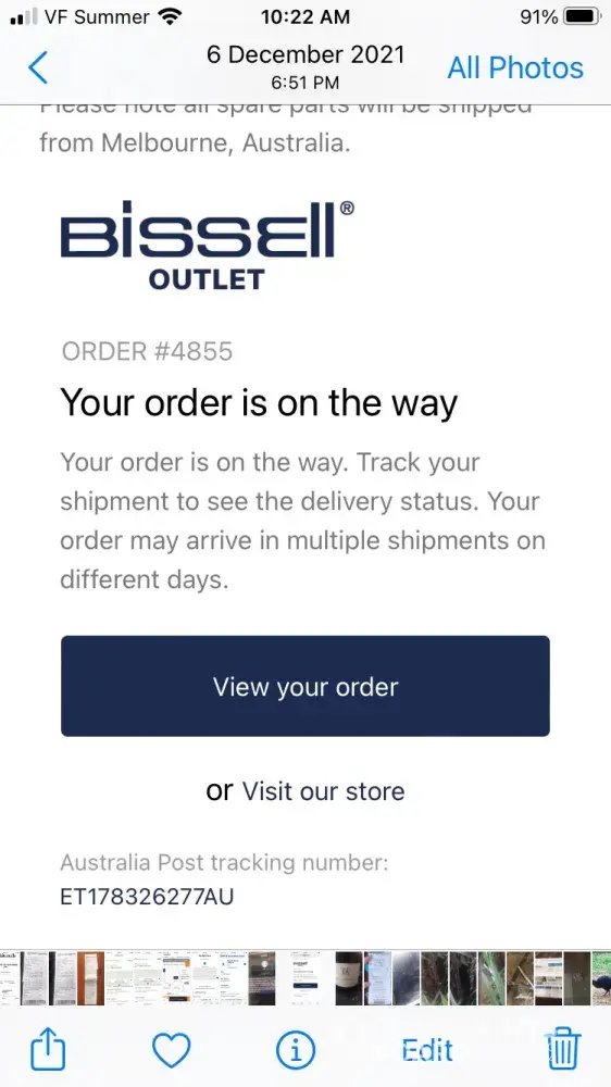 Hi there. We ordered a bissell part for our carpet cleaner on the 20/11/21 and still we have heard nothing not even an email to say where the item is. Item was ordered on bissell website, order number is 4855. I have rang your department on a number of times and get a different story every time. Can someone from your department track this order and find out where this item is. Thanks carl.