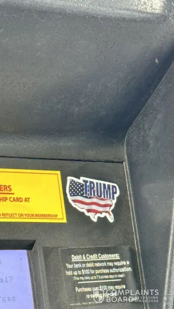 I was at Bjs in Torrington CT and someone put Trump Sticker on Pump. Should not be any stickers let along a traitor advertisement.