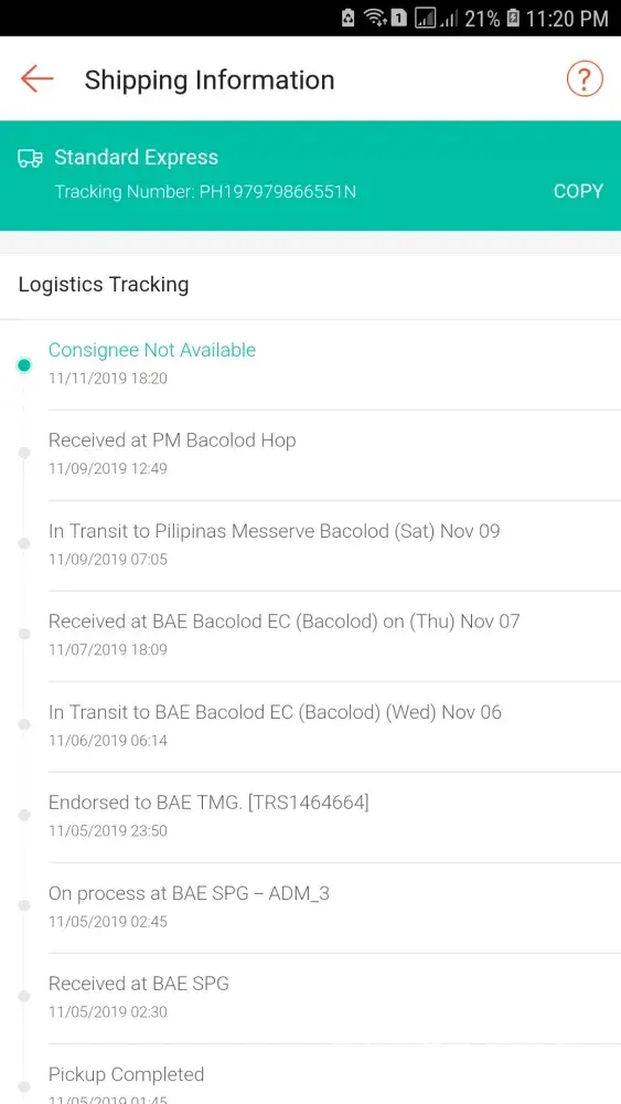 My order from Shopee(PH196306084726W) last October 27, 2019 (10/27/19) shows that it's on delivery by Recilla Romy Gelladula. I did not receive any text or call yesterday and today and no one went to our house to deliver my item. Now the status shows consignee not available. That is not a valid reason because I was waiting for my parcel and nothing called me. Please deliver my items as soon as possible.