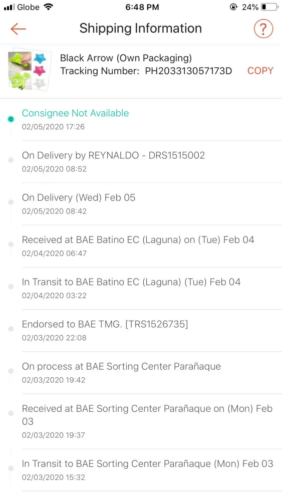 Black arrow is notorious for tagging the delivery as consignee not available when no delivery attempt was made. My packaged arrived in Iloilo Tuesday, I had to reach out to shopee since there was no movement after 2 days. They attempted to deliver Saturday and waited the entire day and by 6pm, they tag my delivery as consignee not available. I had a separate order which arrived Friday in the city and was immediately delivered by Ninja Van. If you value your health and mental health, DO NOT select Black Arrow express.
