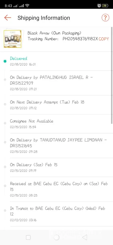 I need help with my item. Sa Shoppe app po, naka tagged na as delivered yung item where in fact, wala po ako nareceive.. wala rin pong tawag galing sa delivery guy. Im wondering po, sino kaya nag receive ng package. Wala po akong contact number ng nagdeliver, name lng po at tracking number. Ito po ung nag deliver, ISRAEL R. PATALINGHUG-DRS1522909