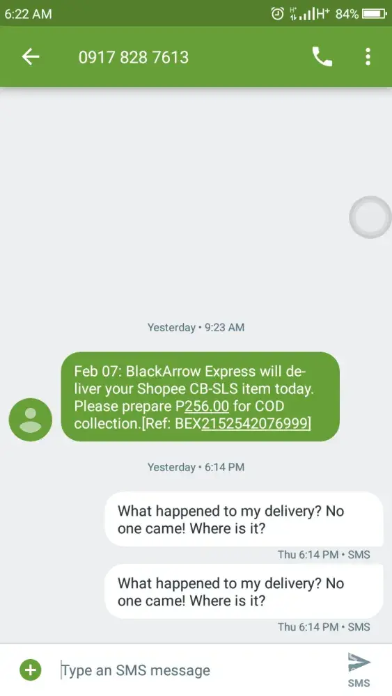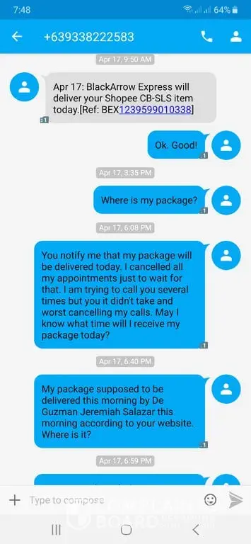 I have just received a text message this morning at 9:50 AM from this mobile number: +639338222583 stating "Apr 17: BlackArrow Express will deliver your Shopee CB-SLS item today.[Ref: BEX1239599010338]" but as of this time (6:49 PM), I have not receive my package yet. I cancelled all my appointments for today just to wait and receive my package. I've tried to contact the said mobile number but didn't reply on my messages and didn't take, worst cancelling my calls. May I know what time tonight will I receive my package?