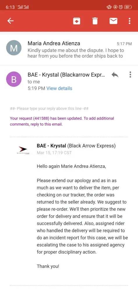 Hi. My product was supposed to be delivered friday(March 15) morning bcos they texted me that the delivery man is on his way. I replied that I'm available until 12 30 in the afternoon bcos I have to attend class. I waited and the delivery man texted me that he wasn't able to deliver it on time and told me that he will come the next day earlier(March 16). But up until now I'm still waiting for my parcel to be delivered. Read something online that balck arrow always listing consignee not available in shopee and then won't deliver it even though the cosignee is around. I hope you will help me in getting my order. Thank you!