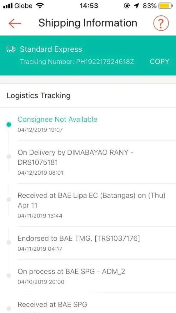 On the same date March 12, in the shopee tracker it said that consignee not available. I was shocked that this was marked as not available when the delivery guy did not even send me a message and failed to contact me.