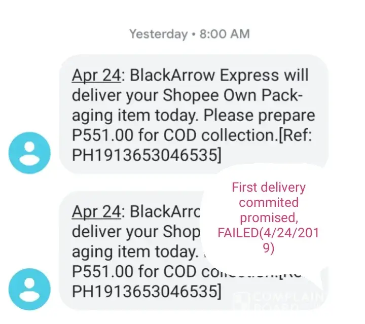 Nag order ako ng item sa shopee, which is supposed to be delivered by the useless shipping carrier na "BlackArrow Express". The day the item status became to be delivered which is by again the useless carrier "BlackArrow Express" nag text sila oh yung delivery man ba yung nag text na darating sila sa araw na to which hinintay naman namin buong araw na galing pa kami work that day sa hanggang nka tulog nlng kami at nka gising around 6:30 pm na wala mn lng text or even missed call from the same number na nag text initially na may darating na item. I then texted kung nasaan na sha oh kung darating pba pero waang reply at all. Pag check ko nlng sa item status ko ulit sa shopee "delivery refused" na! Pambihira wlang kwenta talaga! The next day tinawagan ko yung number na nag text pero dini decline na at di nag reply! Napa na walang kwenta na shipping carrier to, oh baka nmn ung taong nagdeliver lng tlaga yung tanga oh hindi sumipot!