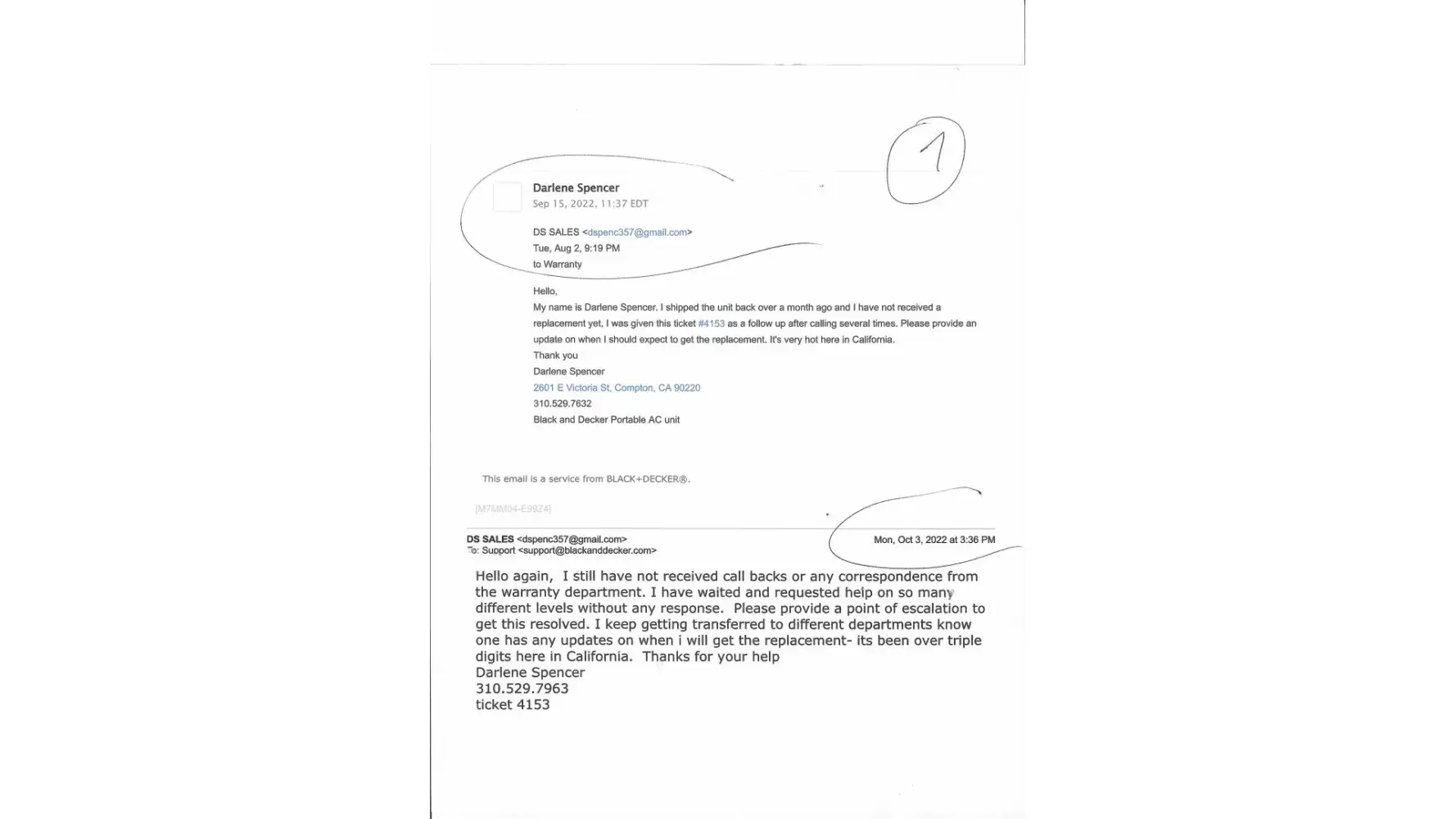 I purchased a B&D AC in July of 2021 (pic 1). This unit worked for 2 months before failing to blow cold air. I submitted a warranty claim that was accepted. I boxed up defective unit and returned it with B&D shipping label they provided. A replacement was eventually sent. No paper work was sent but this pic of shipping label gives mod #, date and replacement designation (pic 2). This unit also failed to blow cold after several months. I again filed a warranty claim that was accepted (pic3). I've returned defective unit number two with prepaid label also (pic 4). I have been told this unit was not reparable. Since then I've had no communication from B&D, emails go UN-answered and phone calls only tell me that no tracking # had been issued for replacement and that's all they can\will provide. I would like to get this part of my B&D experience behind me. Would you please send me unit number 3? Please...B&D BPP10WTB Portable AC- WARRANTY CLAIM ticket #8587.