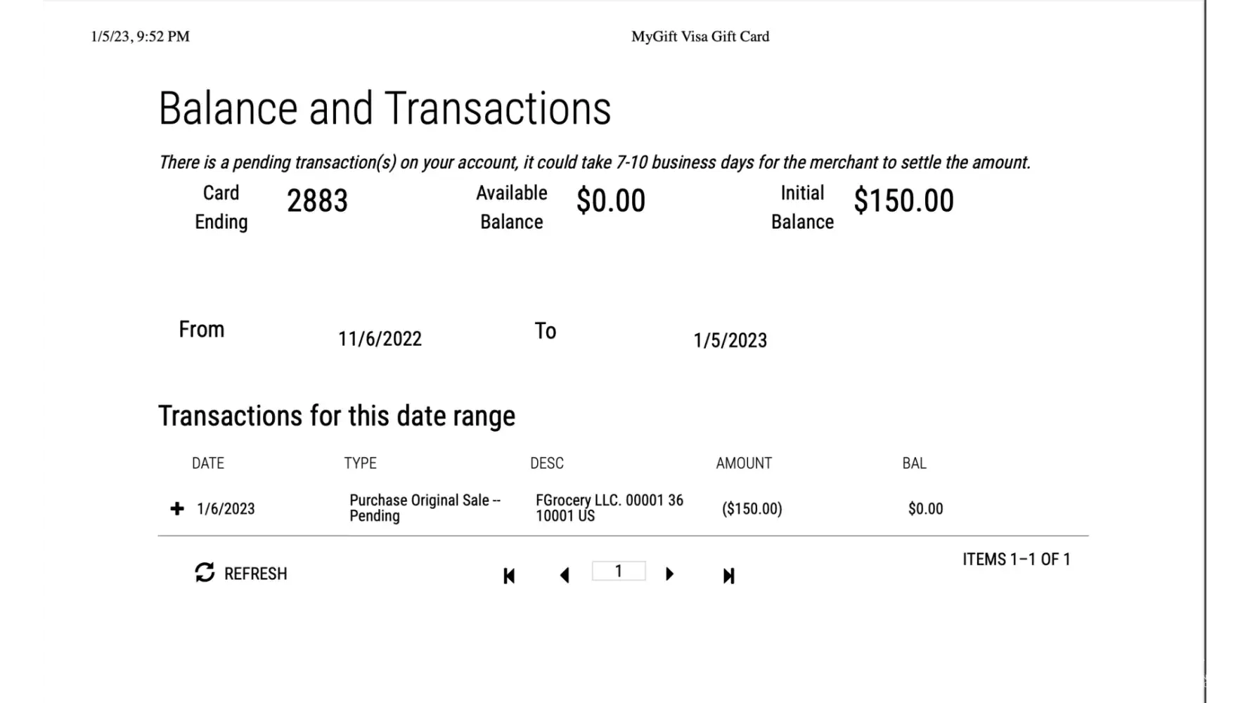 On January 5, 2023, I needed to check the balance of a gift card I had received a year prior, but never used. The back of the Visa Prepaid gift card instructed to go to https://mygift.giftcardmall.com. I went to the site and entered the card number, expiration date, etc. and after submitting it immediately redirected to Target.com's main page. It did not show my balance before redirecting. I tried twice, and felt uneasy as I have never had this happen before. I got home from work and tried again and this time it brought me to the balance page only to show me that a transaction is PENDING for tomorrow, January 6, 2023, for the FULL amount of my gift card, which was $150.00 to "FGrocery LLC." This would have been in a 3 to 4 hour window.