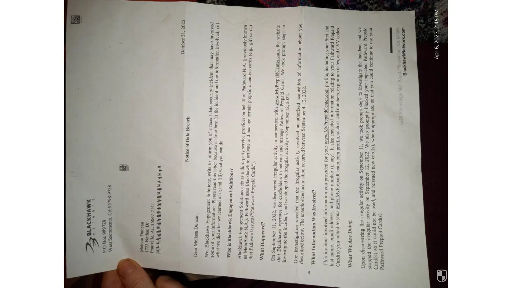On October 31, 2022 I received a letter stating my personal information was involved in a data breach. On September 11, 2022 they discovered irregular activity. The unauthorized acquisitions occurred on September 4 through 12 2022.