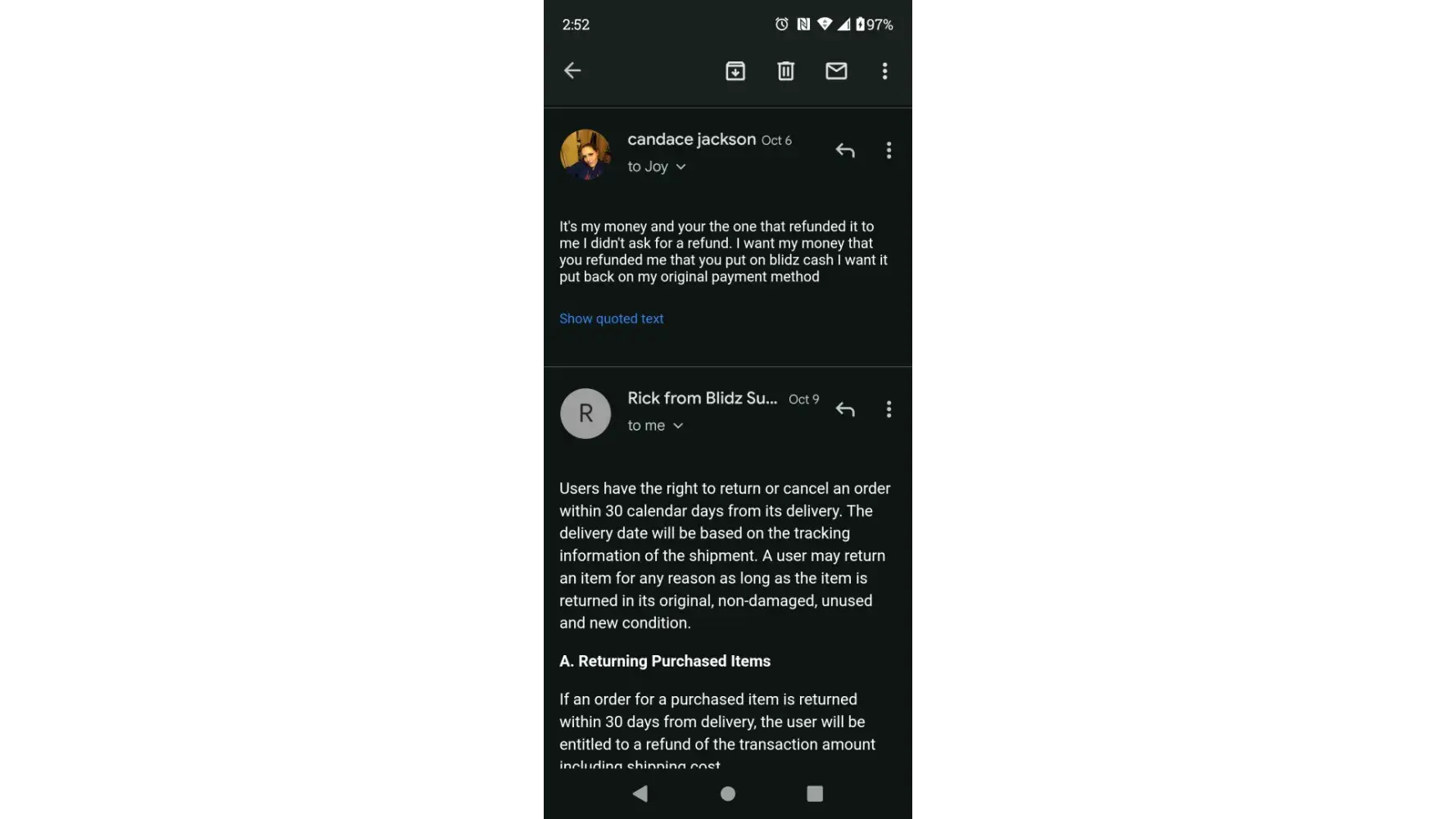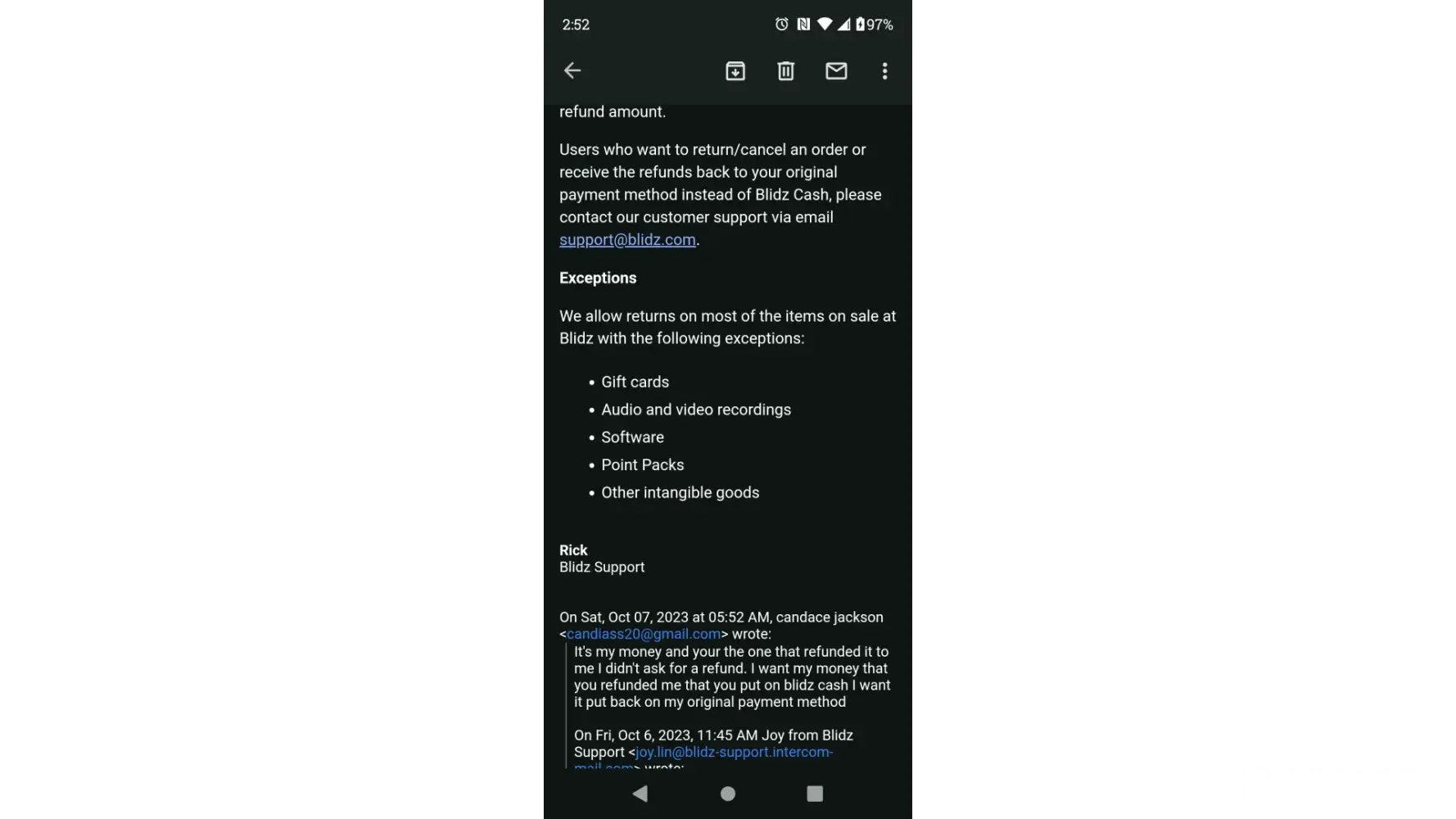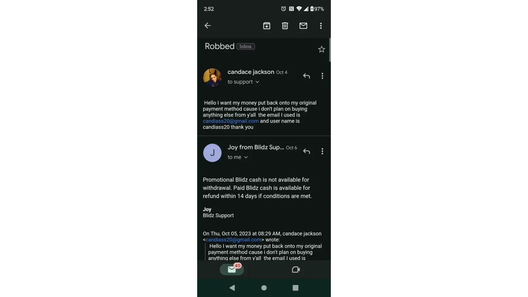 Desired outcome: I just want my money back into my original payment method I will never again use their app I have more emails