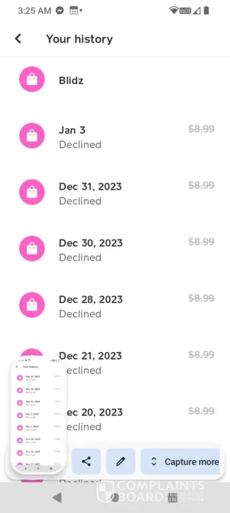 On January 25th I was charged for $12.99 from my card ending in 7862 again on February 25th I was charged for $12.99 from my card ending in 7862 I did not authorize these I've never ordered or used this app/ website. Also money was taken out because it says I have $14 of blidz cash. I just want all 3 amount refunded and the account closed. I've wrote to you guys 3 times now.