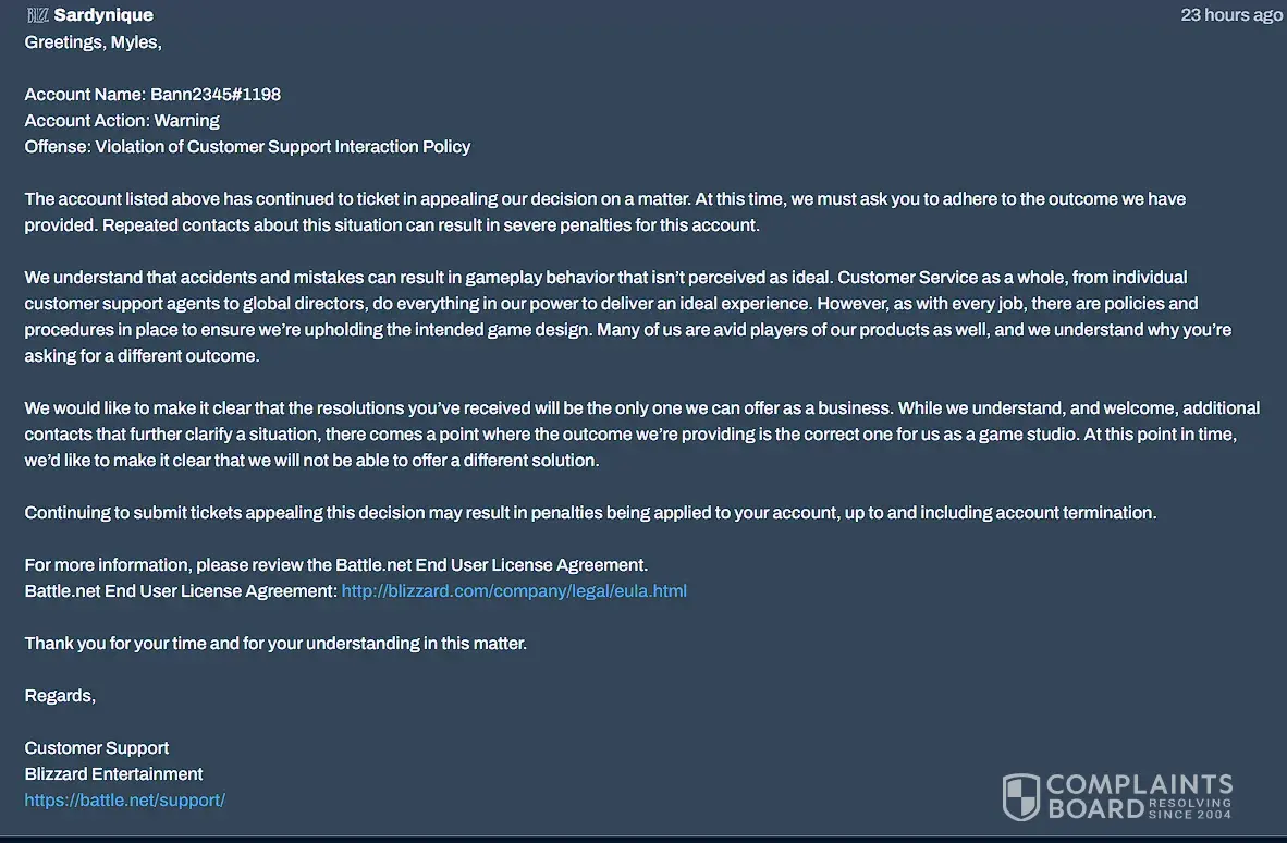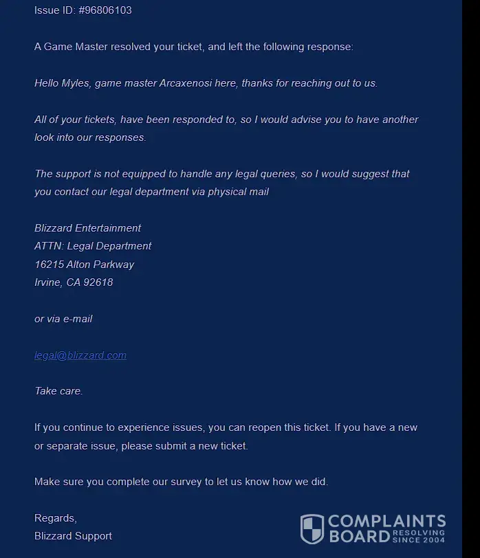 - While Blizzard Entertainment has a high level of trust, our investigation has revealed that the company's complaint resolution process is inadequate and ineffective. As a result, only 14% of 116 complaints are resolved. The support team may have poor customer service skills, lack of training, or not be well-equipped to handle customer complaints.