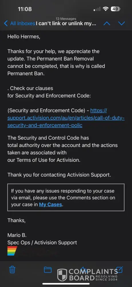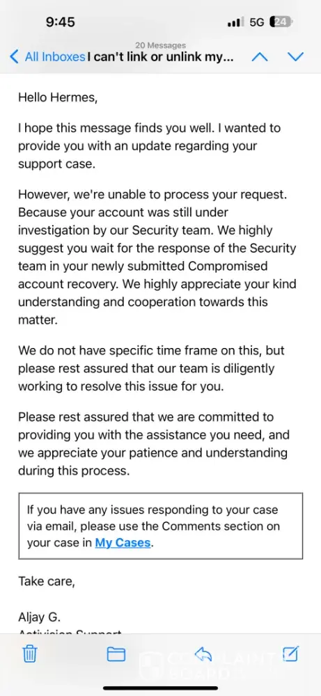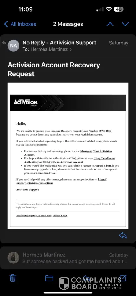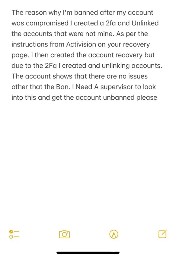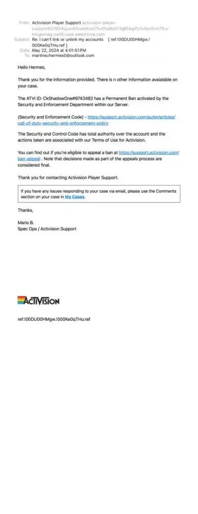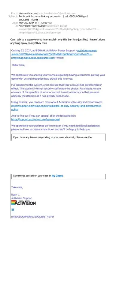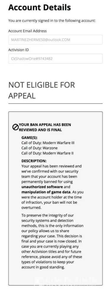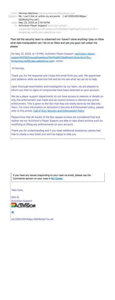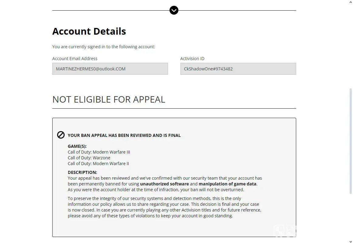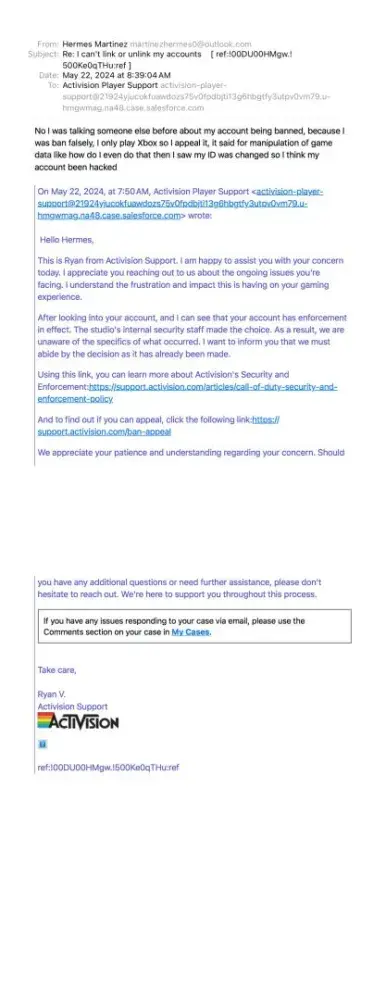 I was falsely ban because my account was compromise Activision ID# CkShadowOne#9743482 and try to appeal and they said it was final then I did the account recovery and it let me talk to someone which I did for 3 weeks with different employees and to no veil they can saying the same thing we are looking in to in.