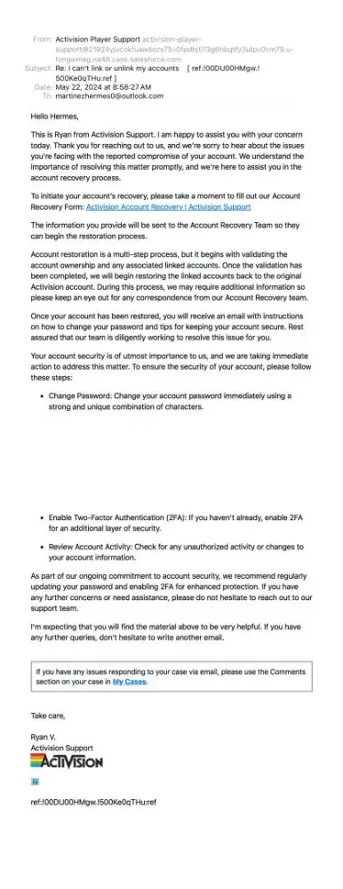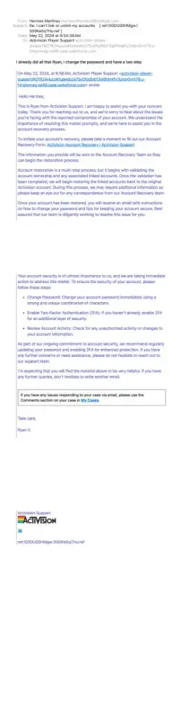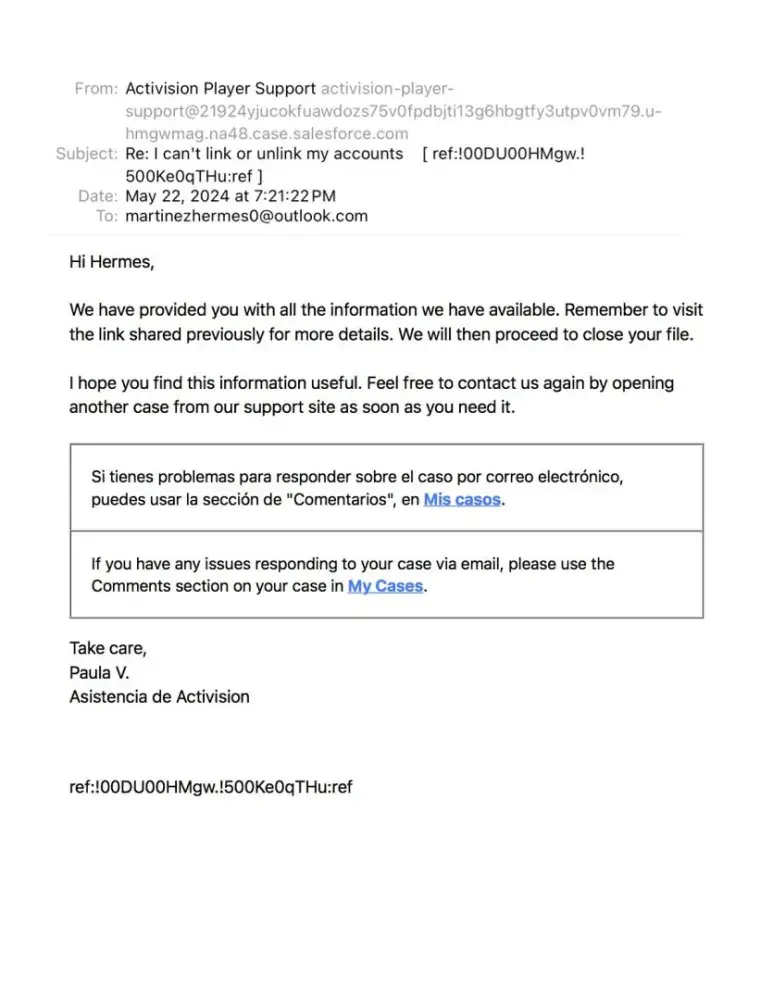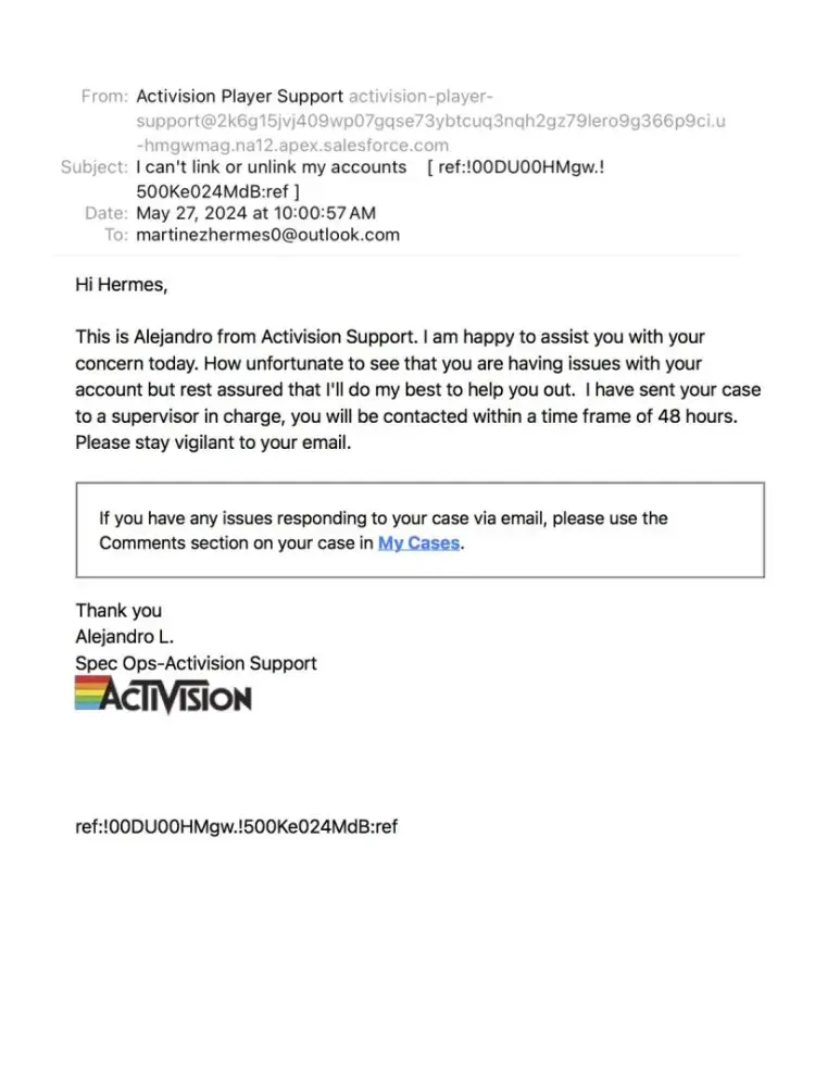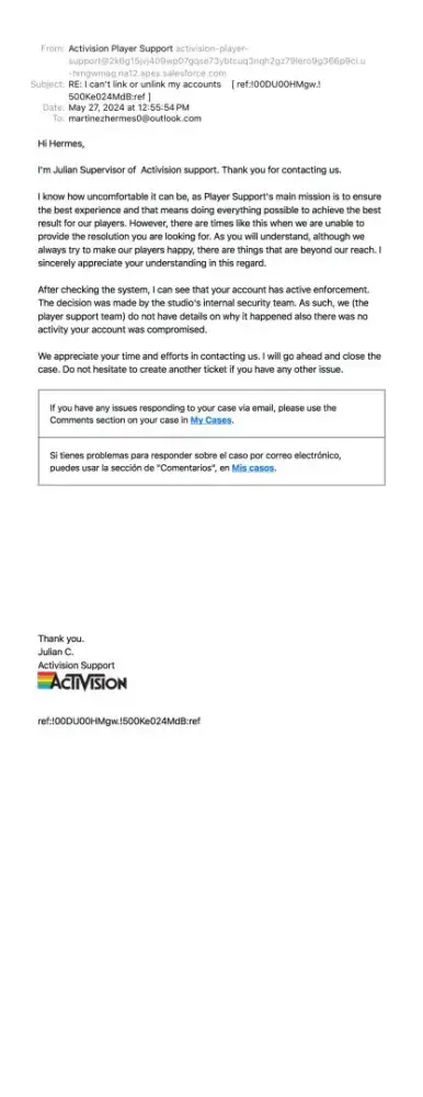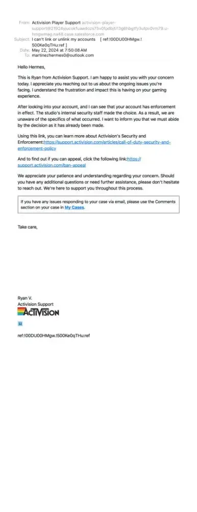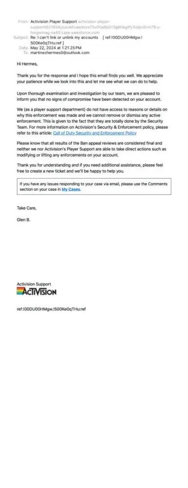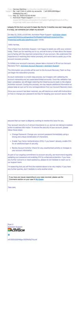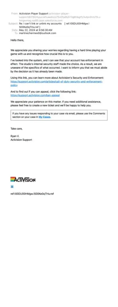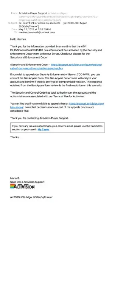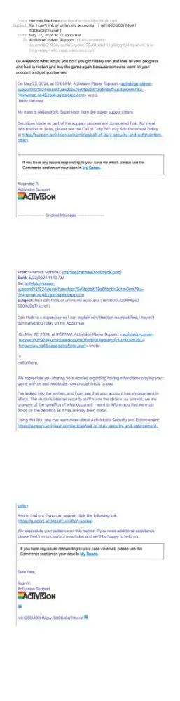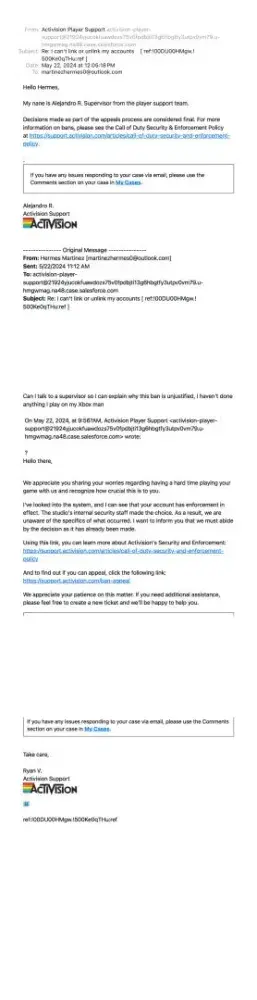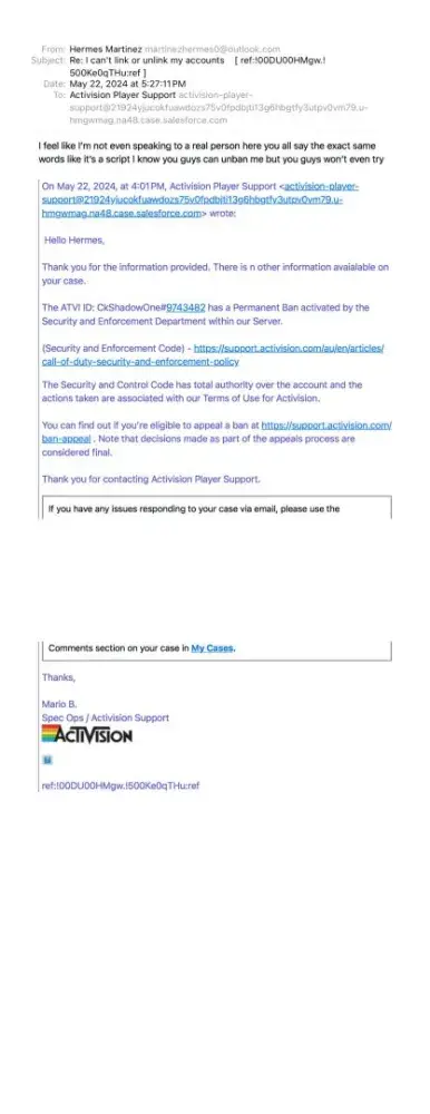 I strongly suspect that Blizzard's customer service replies are done by bots, as they are all the same and and completely ignore my requests. I think it is very unreasonable for Blizzard to deprive me of my usage rights without providing a manual investigation of my account and giving strong evidence, I, as a player and as a consumer, hope that Blizzard can really seriously verify my situation and make a proper handling of the situation, and not to wrong a regular customer.