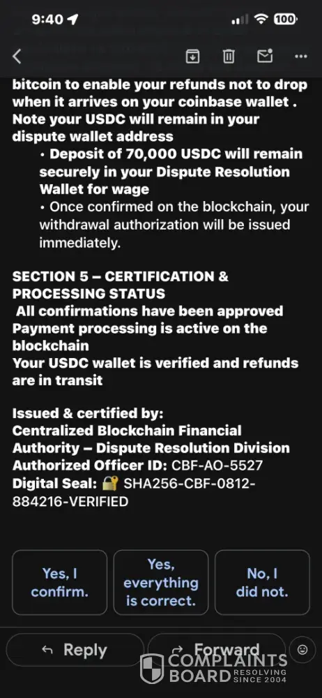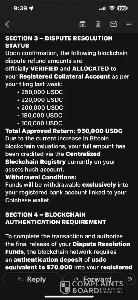 I received a letter via email by Blockchain.com on 2.11.2023 requesting me the deposit of 1 BTC (on the following address 1AMWjt1jXBQYuzZGVNMBNG6VD33fhjs1oC) to carry out the proof of identity to unblock funds to be received from Coinbase. Mr. Michael Conta on behalf of Blockchain.com contacted me and he is still in communication with me. Several communications were received on the head paper of Blockchain.com. The last email was received yesterday via [protected]@blockchain-security.org, asking me to pay USD 15,000 to unblock my money.
