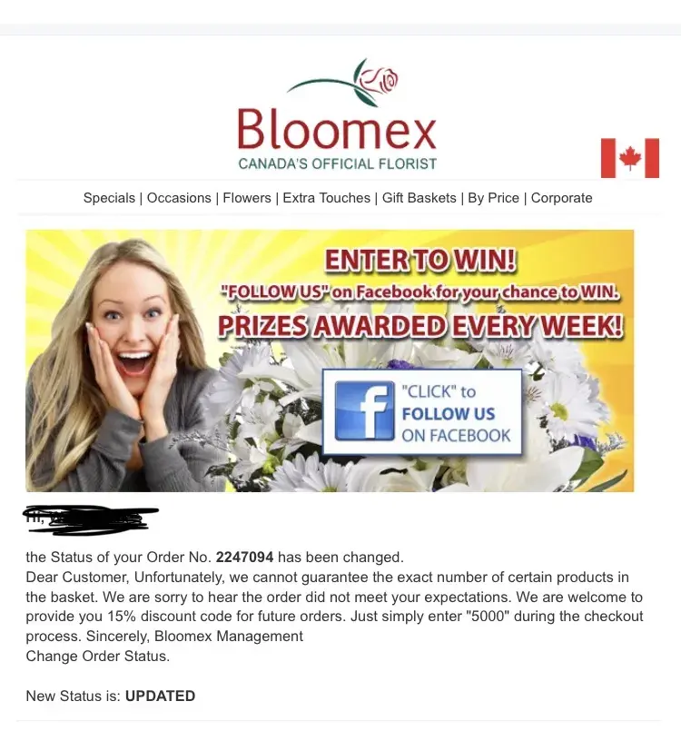 I've ordered from Bloomex.ca a few times and had zero issues. My last two orders have been a nightmare though. (#[protected] and [protected]). The first one was for my partner who is working out of town. Bloomex delivered them 3 days early and my partner is not home. The second order was for my mother's birthday. They were delivered days late to her office on her day off. So it made me look like I forgot her birthday. Both times I contacted bloomed and both times they failed to provide any compensation for their errors.