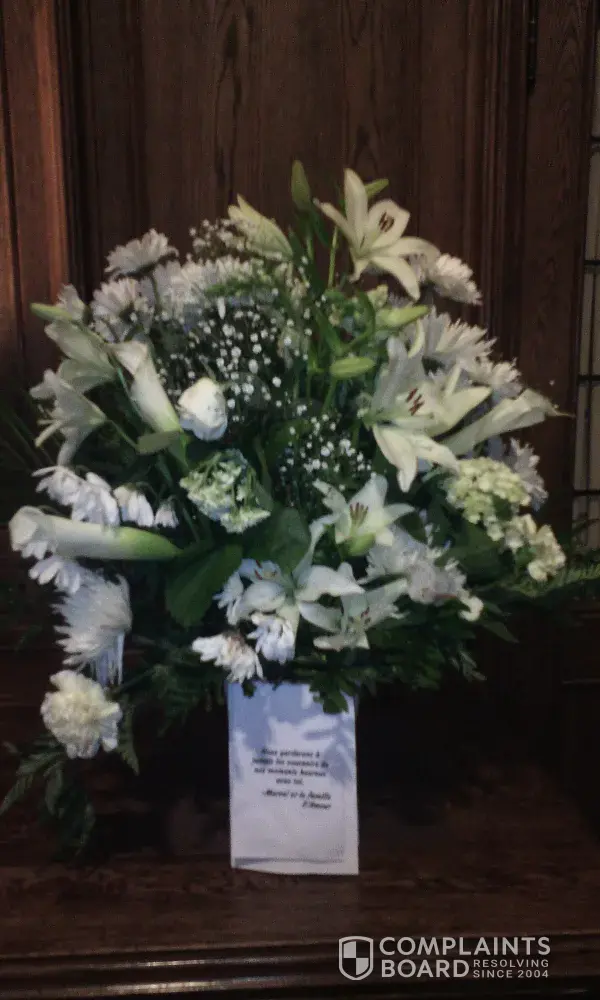 On friday june 22nd 2018, I had a bloomex flower arrangement delivered to a funeral home in Ottawa, to honor and salute the death of a loved one. I chose the arrangement "loving lilies" described as elegant flowers such as creme roses, white lilies, delicate carnations, fresh eucalyptus and more. Approximately 27" W x 25" H. On the web picture you can see 8 creme roses, 11 white lilies and numerous buds, carnation and greens. Since the deceased was an important person to us I chose and paid for the deluxe version. We received a horrible bunch of flowers with only one rose which was already wilted, 3 cala lilies, some white lilies and the space left by the missing roses was filled with some cheap wilted chrysanthemum, wilted hydrangea flower some cheap carnation. We were horrified to see those flowers, they looked as if they had been picked up in the garbage of a cemetary. Bloomex advertises on it's first page "freshest flowers guaranteed". I was ashamed to see my name in that bouquet and we can never reclaim this moment and make it right.