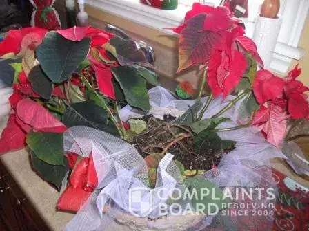 What my sister received was a very broken and dried out poinsettia. All the roots were showing, leaves broken, and dirt everywhere. The tropical plants, corns and decorative ribbons were nowhere to be seen.