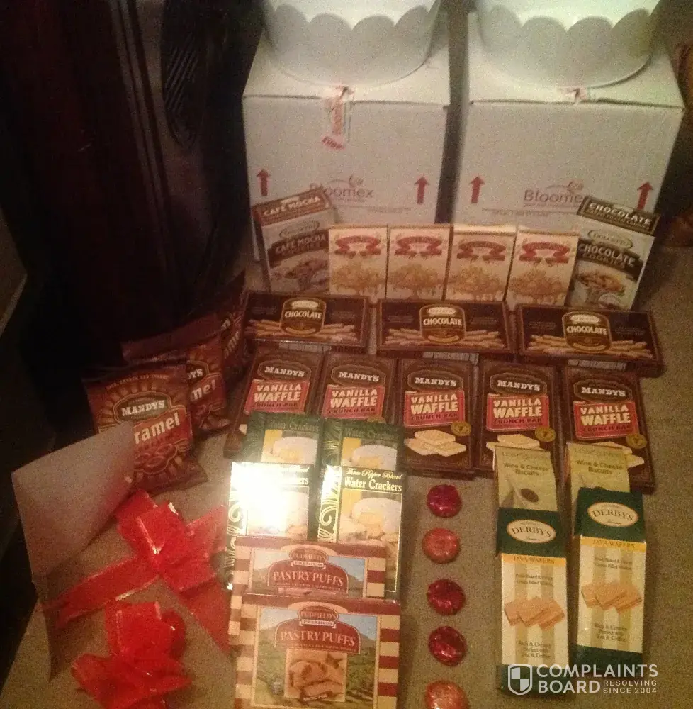 Two Christmas gift "FOOD BASKETS" arrived from Bloomex in TWO BOXES from family in Ontario to 92 yr old mother in British Columbia on December 24th. Both Bloomex Florist boxes were filled with exactly SAME contents - no flowers - just 30 boxes (2oz - 5oz size) of assorted waffer cream sweets, each one made in Indonesia. 22 boxes were DUPLICATED ITEMS. Only 9 originals. The order was confirmed by Bloomex THREE DAYS LATER as to be "EUROPEAN SAMPLER BASKET" (fruit) and "CHEESE LOVERS BASKET" (cheeses, crackers, toasts, breadsticks and seafood). There was none of that except for duplicate cracker boxes. There was not one fruit, not one seafood. 5 tiny pieces of cheese LOONIE size with no ingredient labels or Country where packaged or made. Presentation: NO rattan baskets, rather tin-can containers with plastic ribbon. The "greeting card" was just glossy paper folded in half with a standard Violet flower, not signed, no message (empty) but did contain a Bloomex Florist Discount 'advertising coupon' delivered on Christmas Eve.