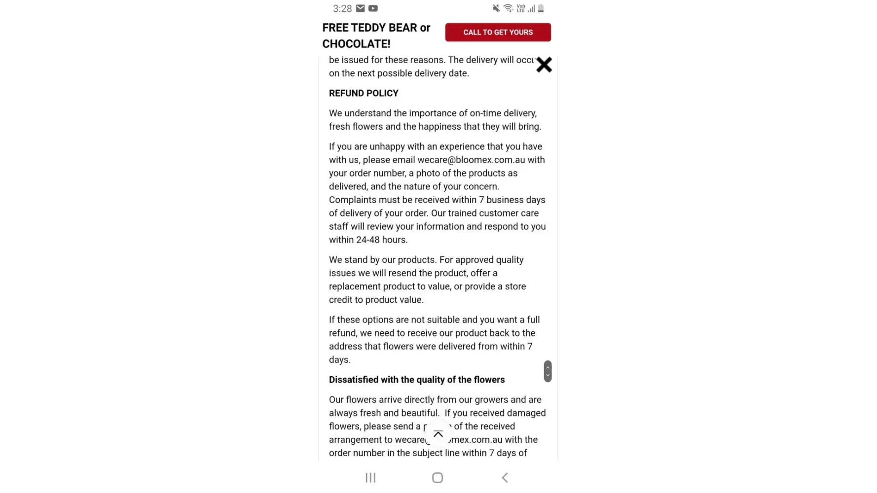 I wish I had read this comment before I ordered flowers from Boomex. It was the worst experience I have ever had ordering flowers on-line. The add was misleading, the delivery took 3 days (although they claim same day service) and despite repeated requests to speak to someone in customer service, I have had no response.