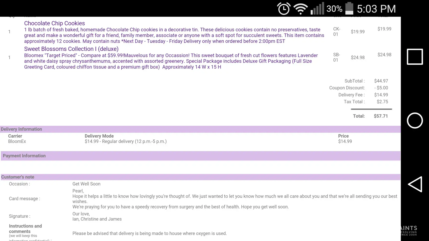 After many Email ( They said another bunch of FLOWERS would to sent ) BloomEx sent my friend a basket of Choc, Nuts and Biscuits on Christmas Eve