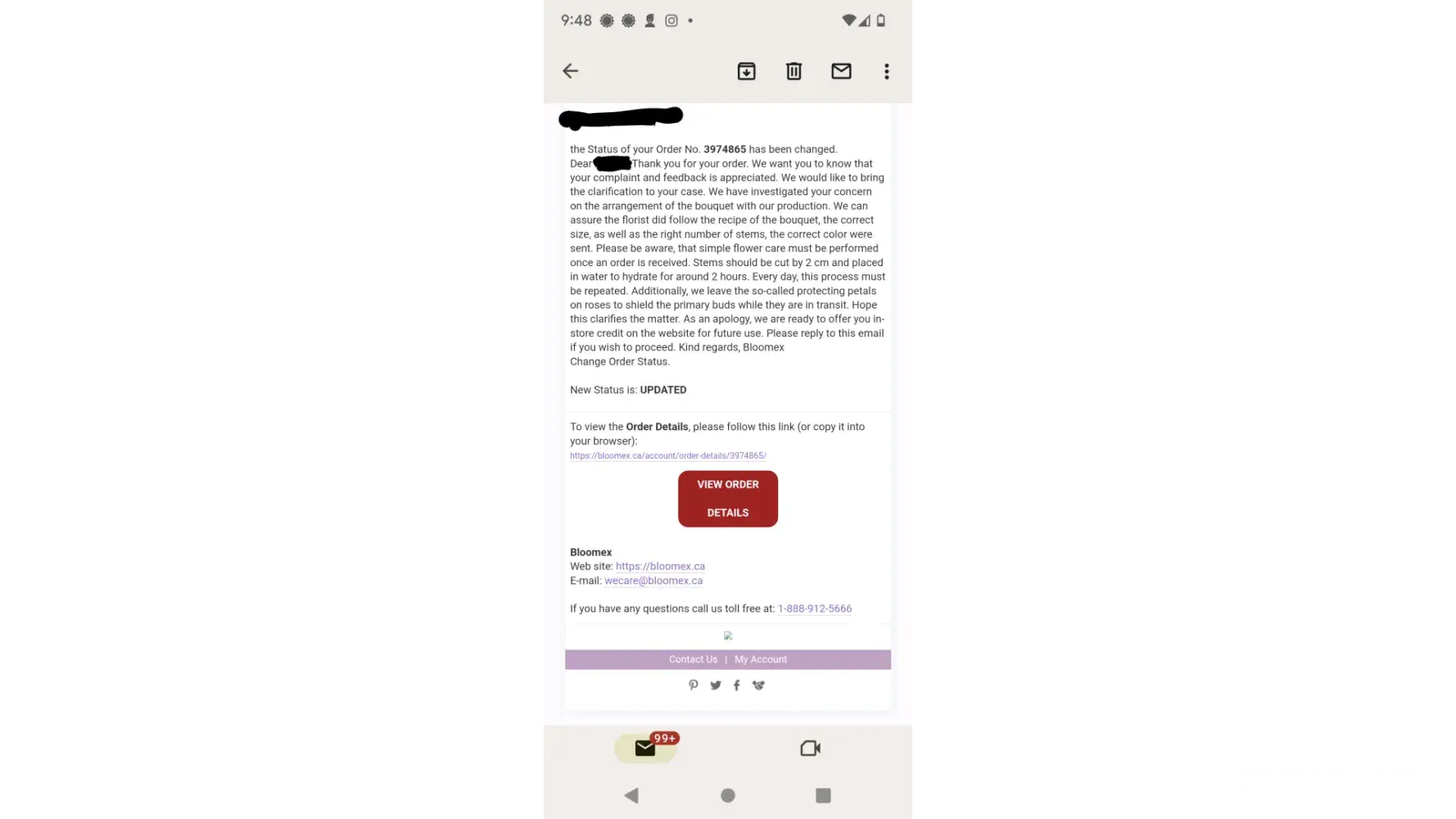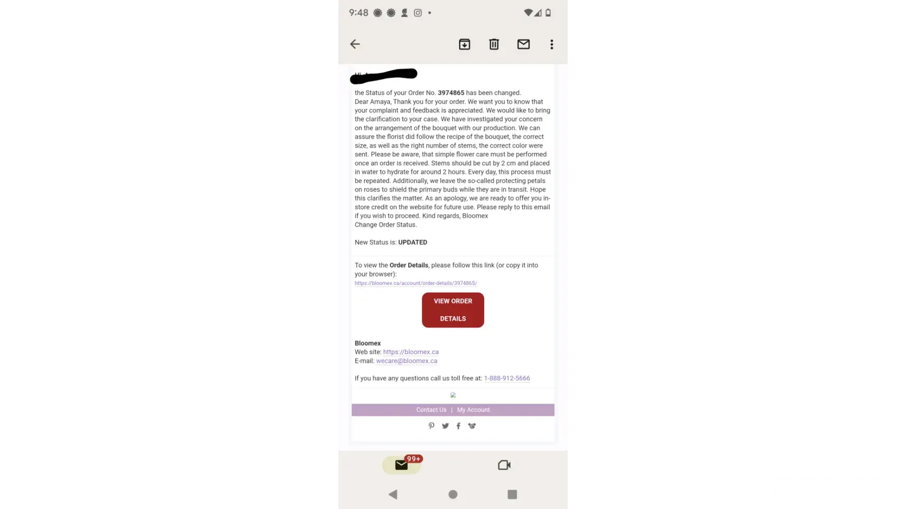 Bloomex Lack of contact after delivering dead flowers