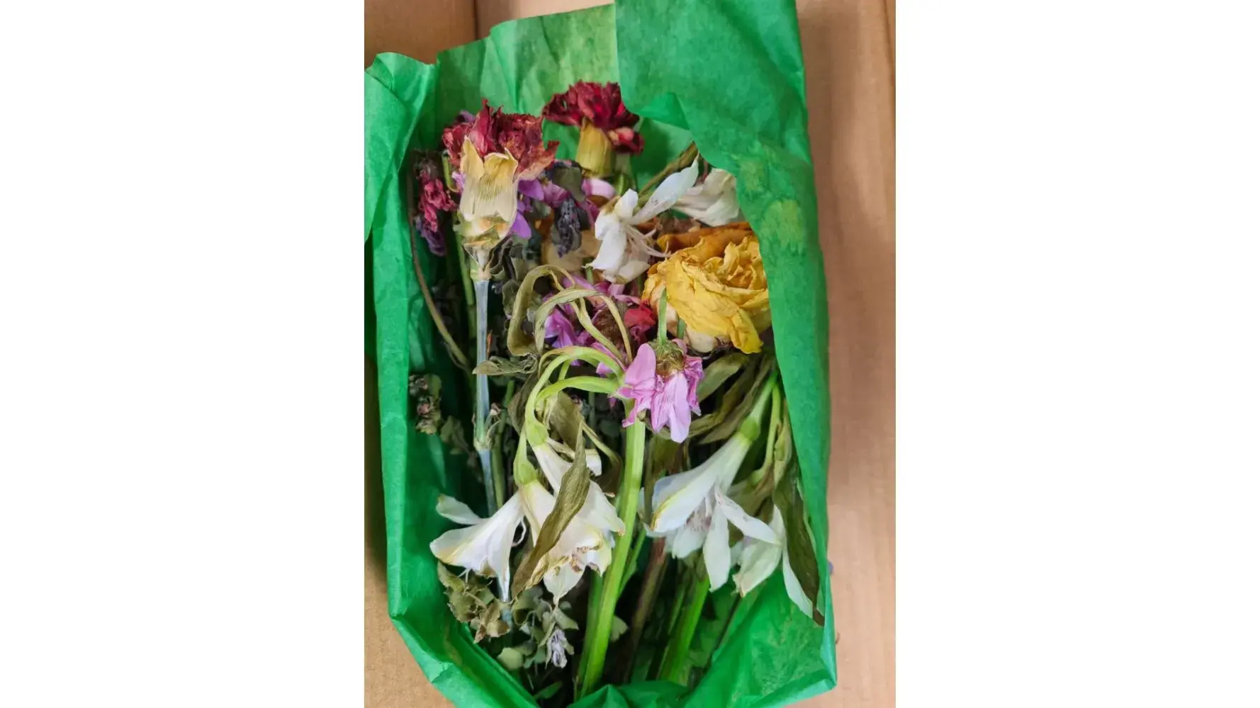 2 the box had been squeezed at some stage, and the flowers have been damaged.
