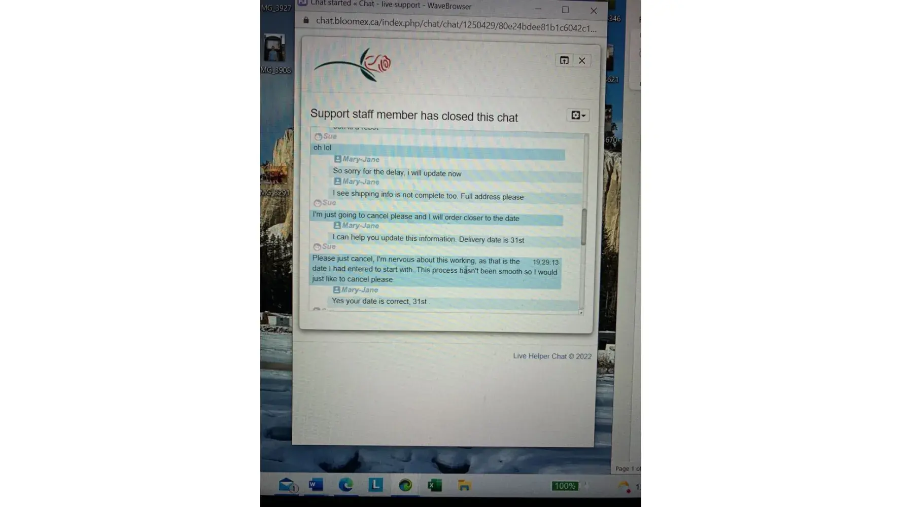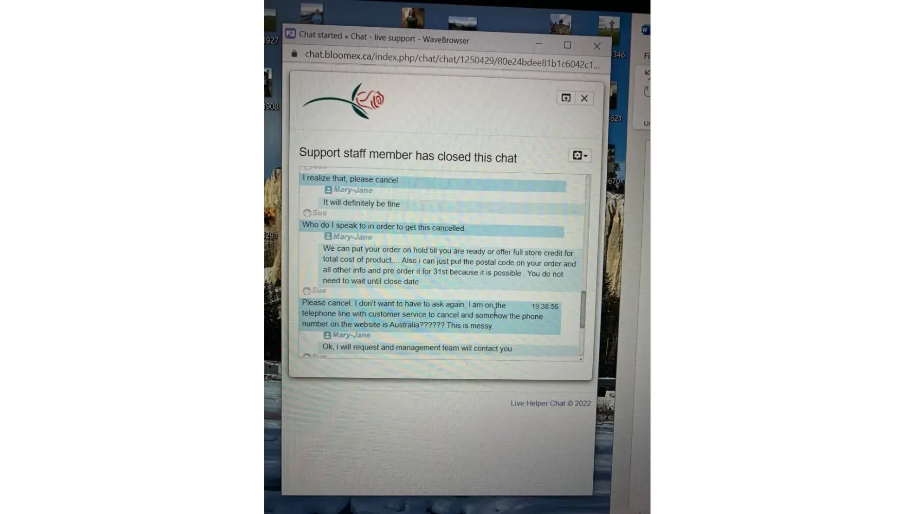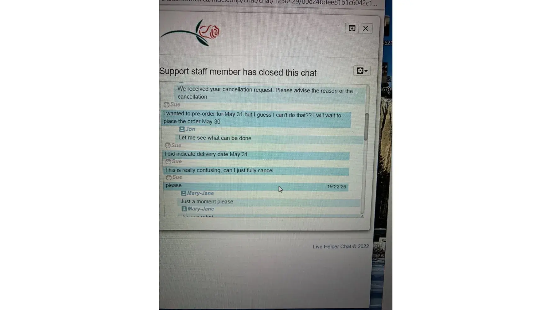 I entered the Bloomex website on May 23, 2022 and was assigned an order #[protected]. I NEVER pressed the submit order button, however, because my credit card was already on file by setting up my account, the order was processed by Bloomex. Then I received a message that my order was "on the way" when the order request date was a pre-order date of May 31. I immediately chatted on-line with an agent requesting cancellation and basically they said they would change and ensure the order date. After requesting several times to just cancel the order, they refused to do so. I called on the telephone line to customer service and three times I was hung up on. I followed up with an email and was advised the next day that I had to cancel within one hour. WHICH I TRIED TO DO as outlined by attached. Since nobody would help me cancel the order, I provided a delivery address (since the order was NEVER finished or submitted). The order arrived today and as outlined in the attached photo, my "Beautiful in Blue" order arrived not even close to advertised. The order I received was various shades of purple yellow & white 90% filler flowers. I have bought nicer and healthier bouquets at my local grocery store. One and done for me. I have told everyone I know about the horrific customer service I received, topped with the delivery of a pathetic vase of flowers. It will be viral and