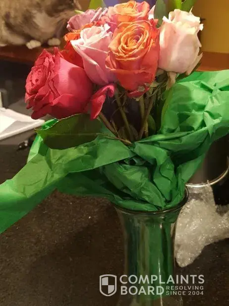 The flowers only arrived there today, 11/10/2022 in a red box with the delivery docket being bloom-[protected]. Upon opening the box, the roses were not the half dozen red roses i ordered but instead multicoloured roses and were basically dead. Please see image attached for reference.