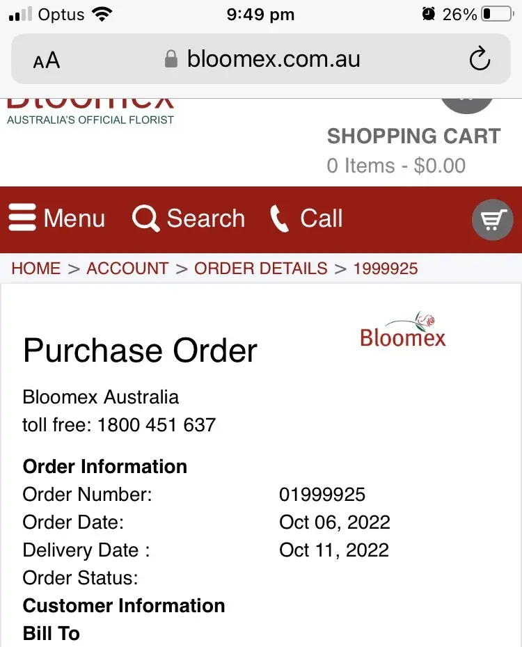 I ordered flowers (order number [protected]) for same day delivery on the 6th of October 22 for my mother-in-law as it was her 70th Birthday. I was immediately charged for the order, with no email confirmation, and no one contacting me in regards to there being a problem with delivery on the same day. Instead, the flowers were estimated to arrive for my mother-in-law on the 11th of October, as stated on the Bloomex website, 4 business days later. They, however, we’re not delivered then either. Eventually, they did arrive on the 12th of October in a droopy/wilted condition with no flower food sachet included. The bouquet looked like it was thrown together in a rush. I’m disappointed with what my mother-in-law received - many days later than expected - and for what I paid just shy of AUD $70 for. I expect a refund for this kind of service.